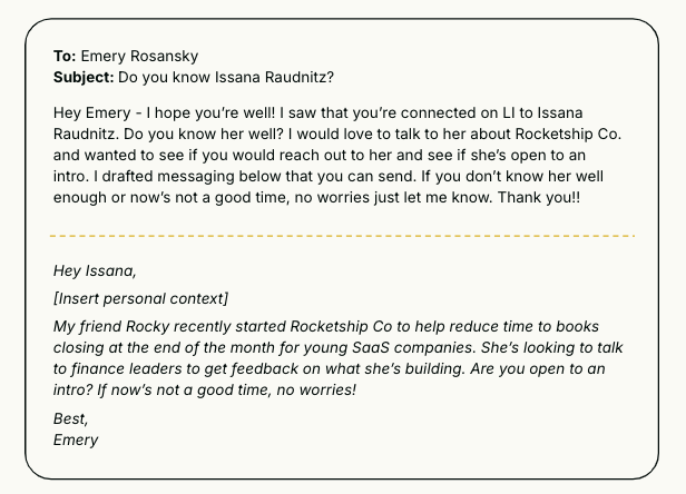 To get face time with your big fish, warm intros can help crack open the door. “95% of the calls we got were through warm intros from our investors, angels, and folks in our personal network,” she says. But as First Round’s own VP of GTM, Emery Rosansky, tells the founders she partners with: make it as easy as possible for the person to help you. Here’s an example she shares with founders who want to leverage their network: