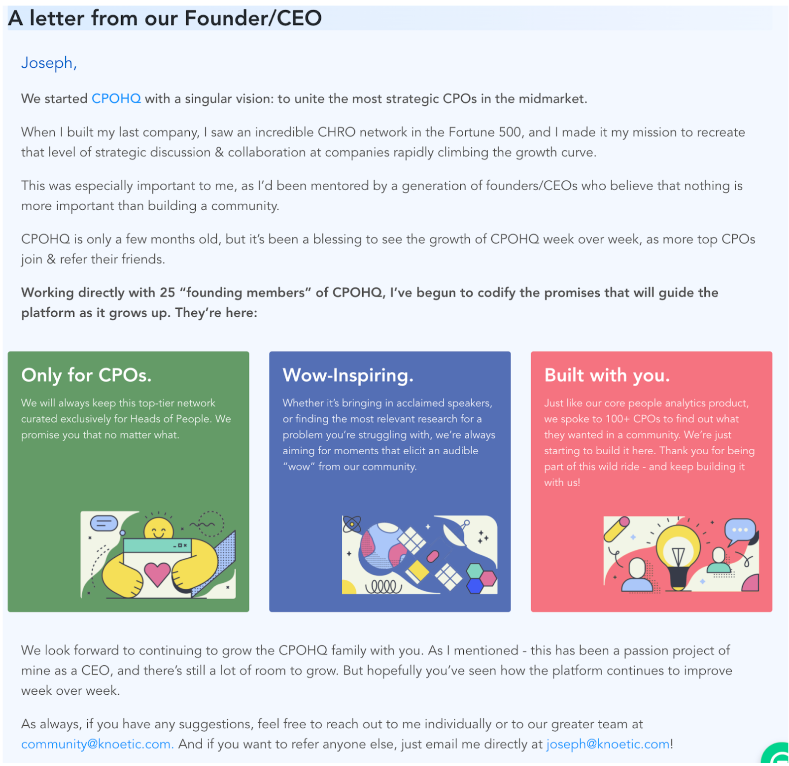 With Quan’s best-laid plans for Knoetic upended in March 2020, he spun up a quick test to validate a few different ideas for the direction in which to pivot. “We queued up several outbound email campaigns targeting CHROs advertising different ideas we were considering building: A tool to help analyze the impact of layoffs, a remote work productivity suite, and an exclusive community for CPOs and CHROs. We hadn’t built any of those things yet, but we knew we could build any of them within a month,” says Quan. “The idea was just to validate the demand for a new direction we would go. As it turns out, the email campaign advertising our community idea got higher engagement than any email I’ve ever written in my life. Something like 40% of the C-Level executives we reached out to responded to the email. It was clear we had a winner.”