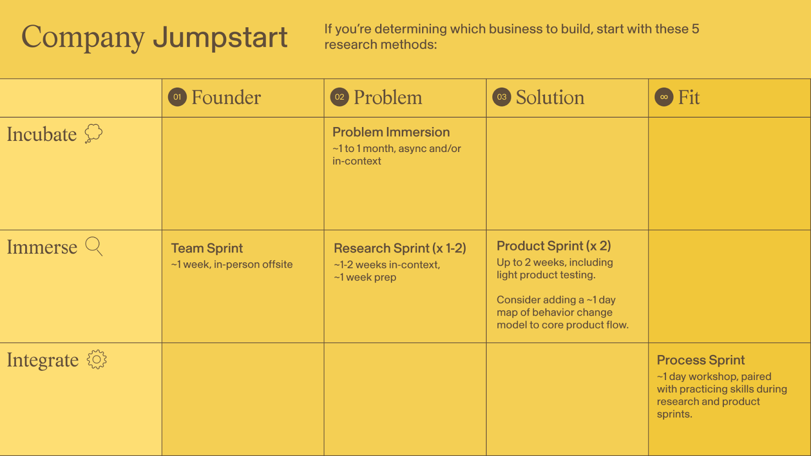 Your three phases of research will look different at each step, alternating introspection with interviews, observation with sprints. Moving through a mix of structured exercises will help you dial up your confidence in choosing the right problem, solution and team. And you don’t have to use every single method listed here — take your pick based on where you want to go deeper.