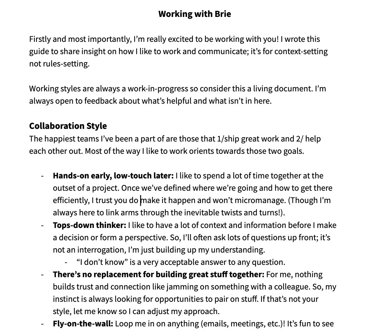 For leaders creating one, be conscious of the implicit power dynamics at play — specifically, whether you are expecting those who work with you to adapt their working style to yours to accommodate your preferences. For individual contributors, I’ve found that this document is a really helpful form of self-expression that leads to better, healthier, more efficient working relationships. When done well, they also show a great deal of self-awareness that help colleagues understand each other a lot better.
