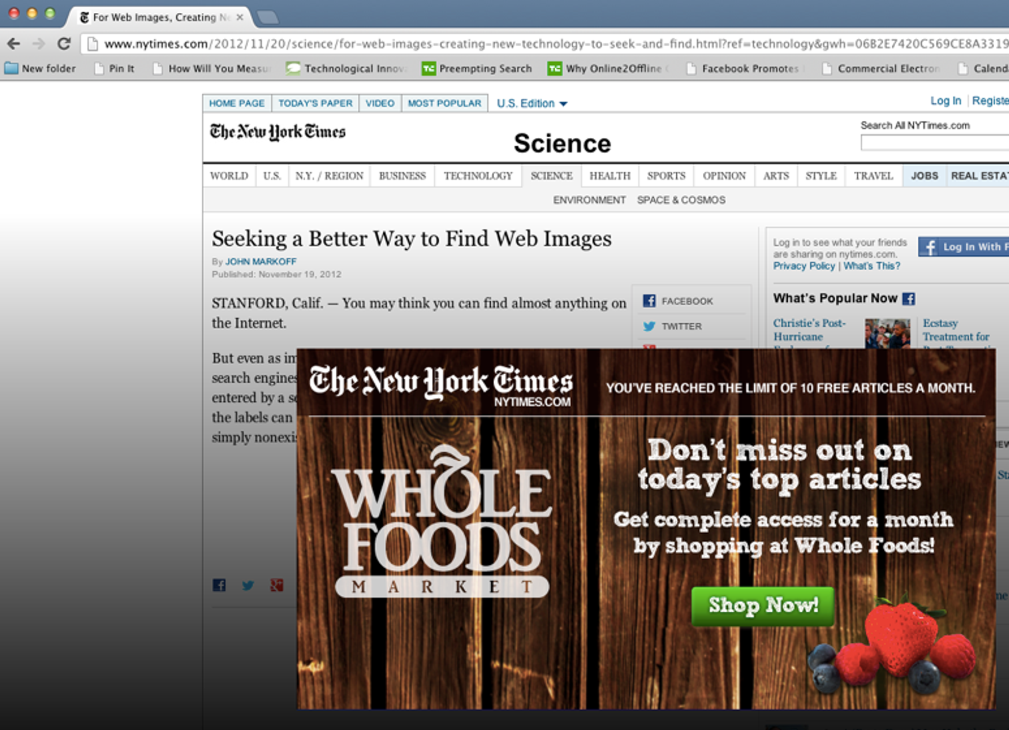 One of the best examples is The New York Times. No matter how little the newspaper tried to charge, most readers wouldn’t pay for online content. So TrialPay embedded a better offer in its subscription flow: Visit Whole Foods’ online store and you can read The New York Times online for free.