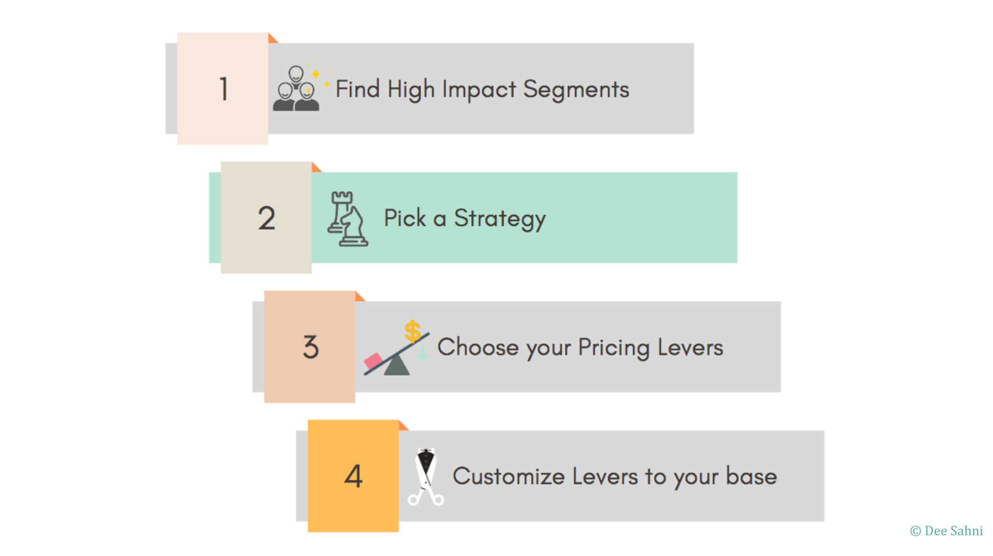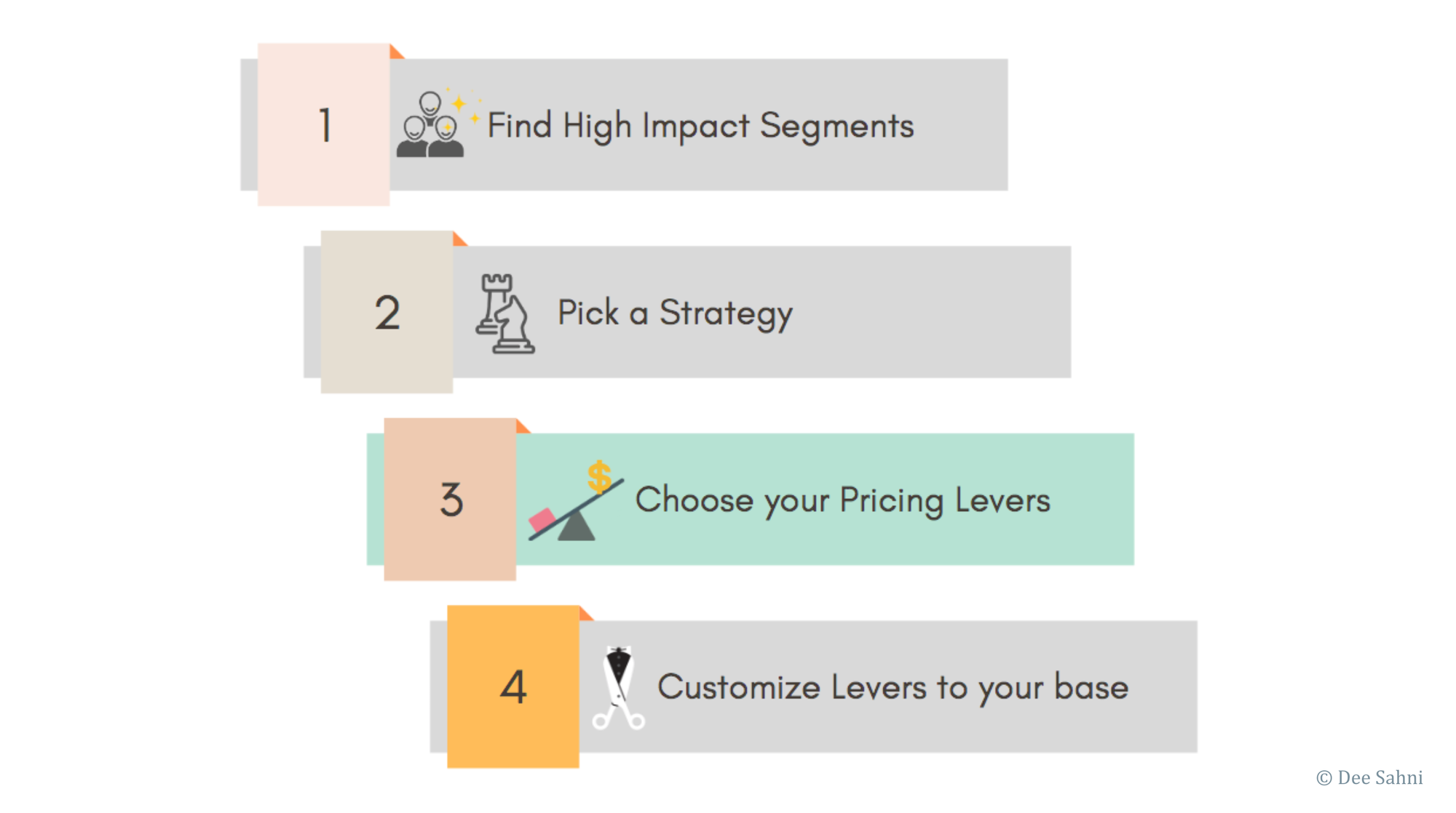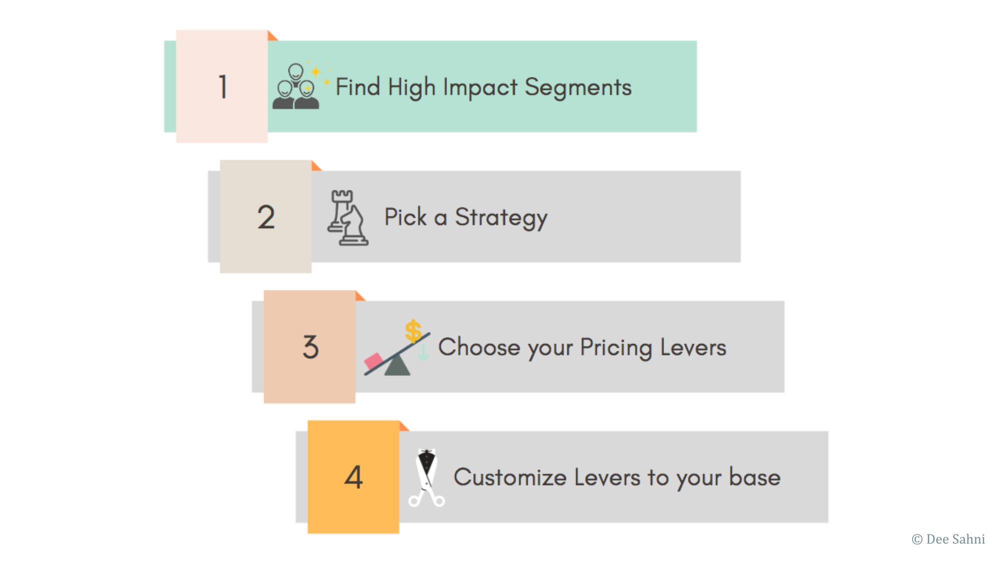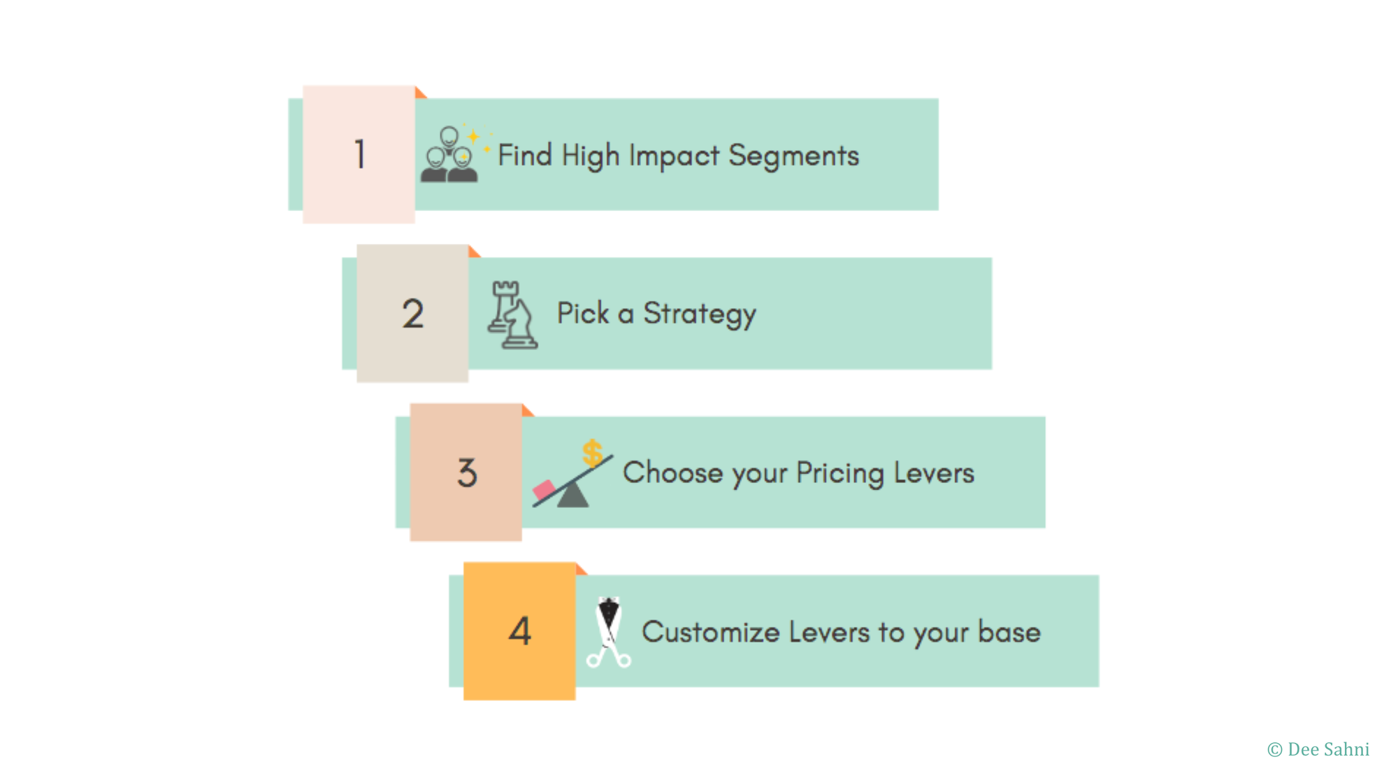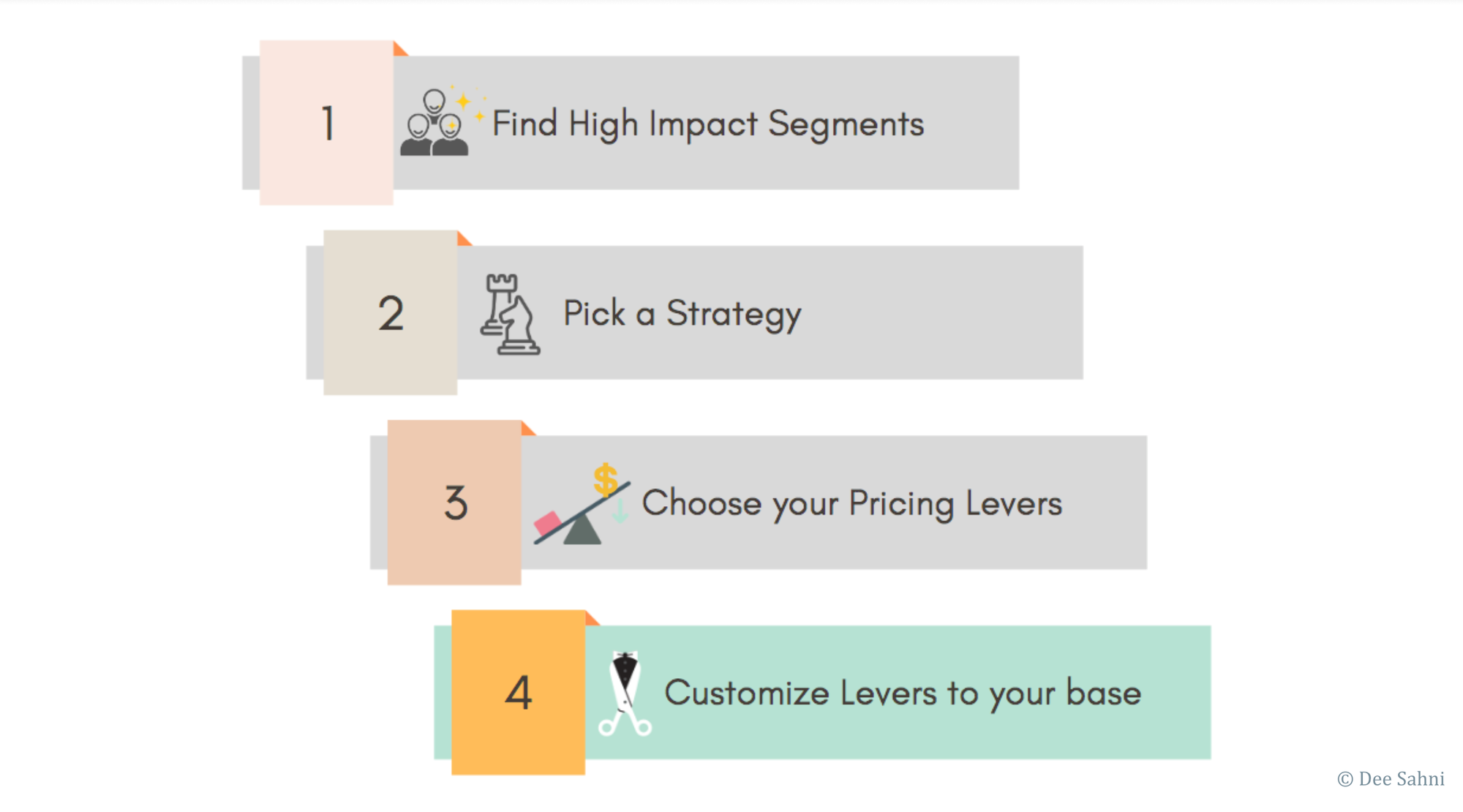 We'll transform the impact of these offending cohorts through a four-step framework. These steps include: Finding high-impact segments, picking a strategy, designing pricing levers to execute this strategy and customizing these levers to our user base.
