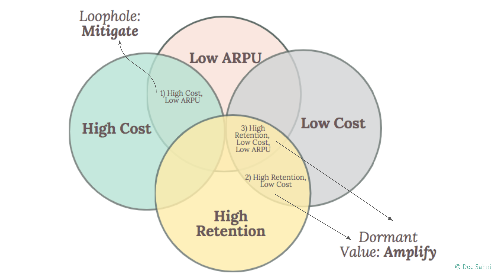 In the most acute margin challenges, you can isolate the problem to a few distinct cohorts that disproportionately impact averages. For example, large segments of high cost, low ARPU (average revenue per customer), or low retention users.