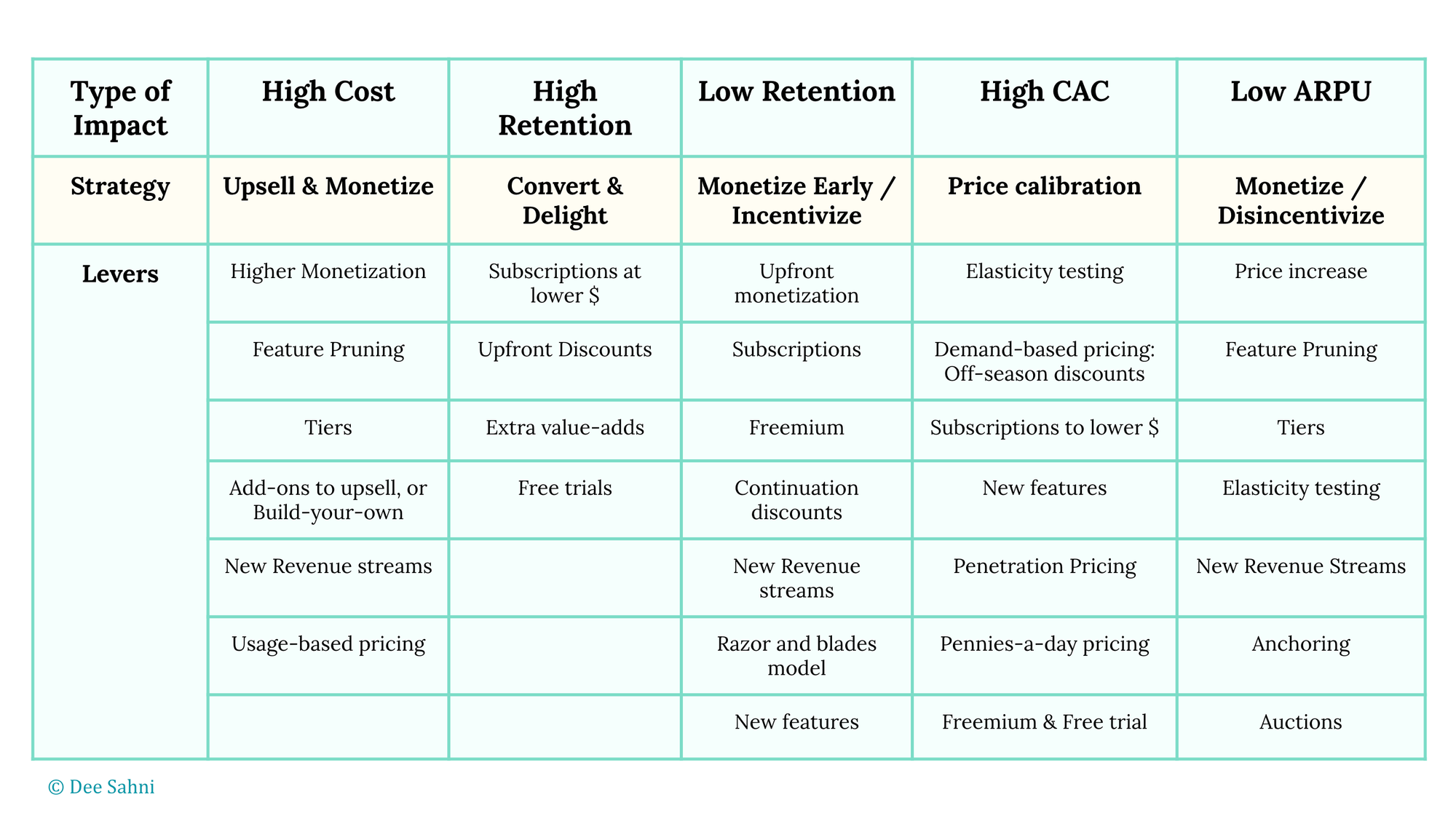 In practice, cohorts can have combinations of impact: high retention + low ARPU, high cost + high retention, etc. Pricing levers and models can overlap to address combinations, like tiers with pay-as-you-go or demand-based pricing.