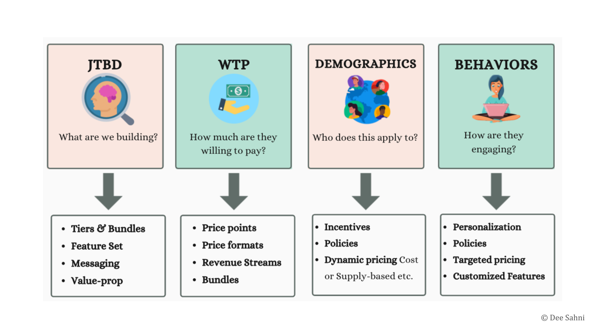 As your product gets sophisticated, layer-in Demographics and Behaviors. Customer growth will give you more data on how they use and engage with the product. Behaviors will allow you to build a more tailored product. And demographics will allow you to serve the right product to the right user. Behavior and demographic-sensitive pricing will maximize value created per customer.