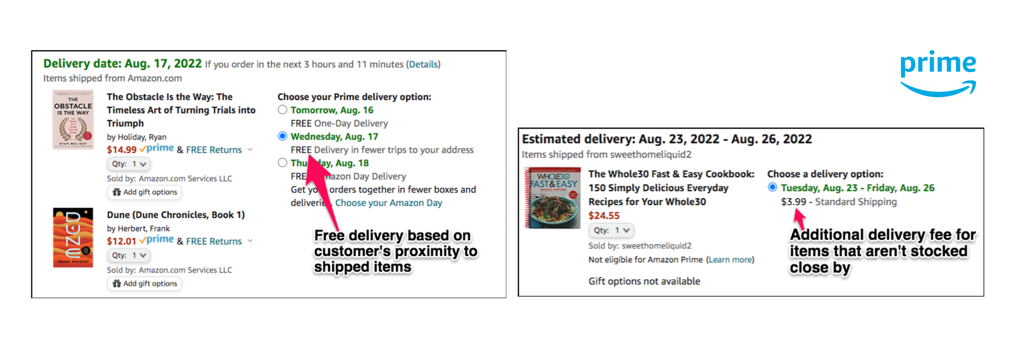 Amazon's delivery fees and windows are adaptive. They change both fees and delivery windows based on costs and a user's proximity to fulfillment centers.
