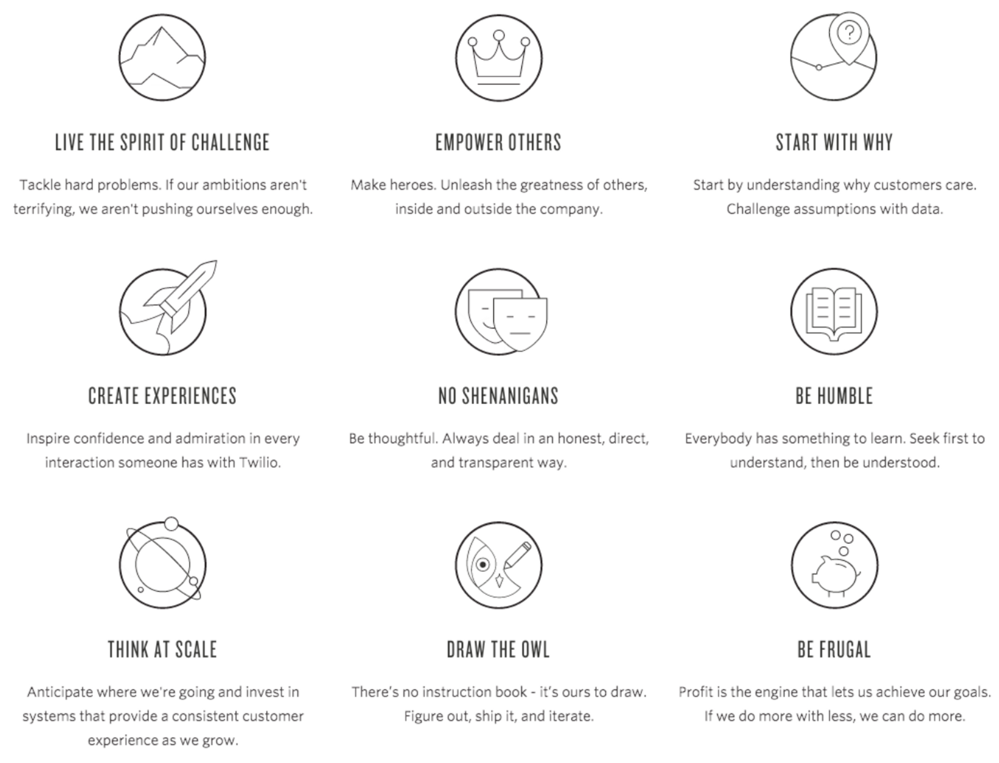 Lawson admits that even if they are specific, nine ‘things’ is still a lot. “Researchers say that human beings can remember seven plus or minus two things. If you ask the average Twilio employee if they can name the nine things, the answer is likely no. I’d probably leave one out. But the way to think about it is that people will pick the ones that resonate most with them — which they can live most fully,” says Lawson. “Three to five just won’t work for us. When you try to narrow it down to such a small number of things, what you end up doing is making that small number of things more abstract and all-encompassing. Don’t trade ‘draw the owl’ for ‘integrity.’”