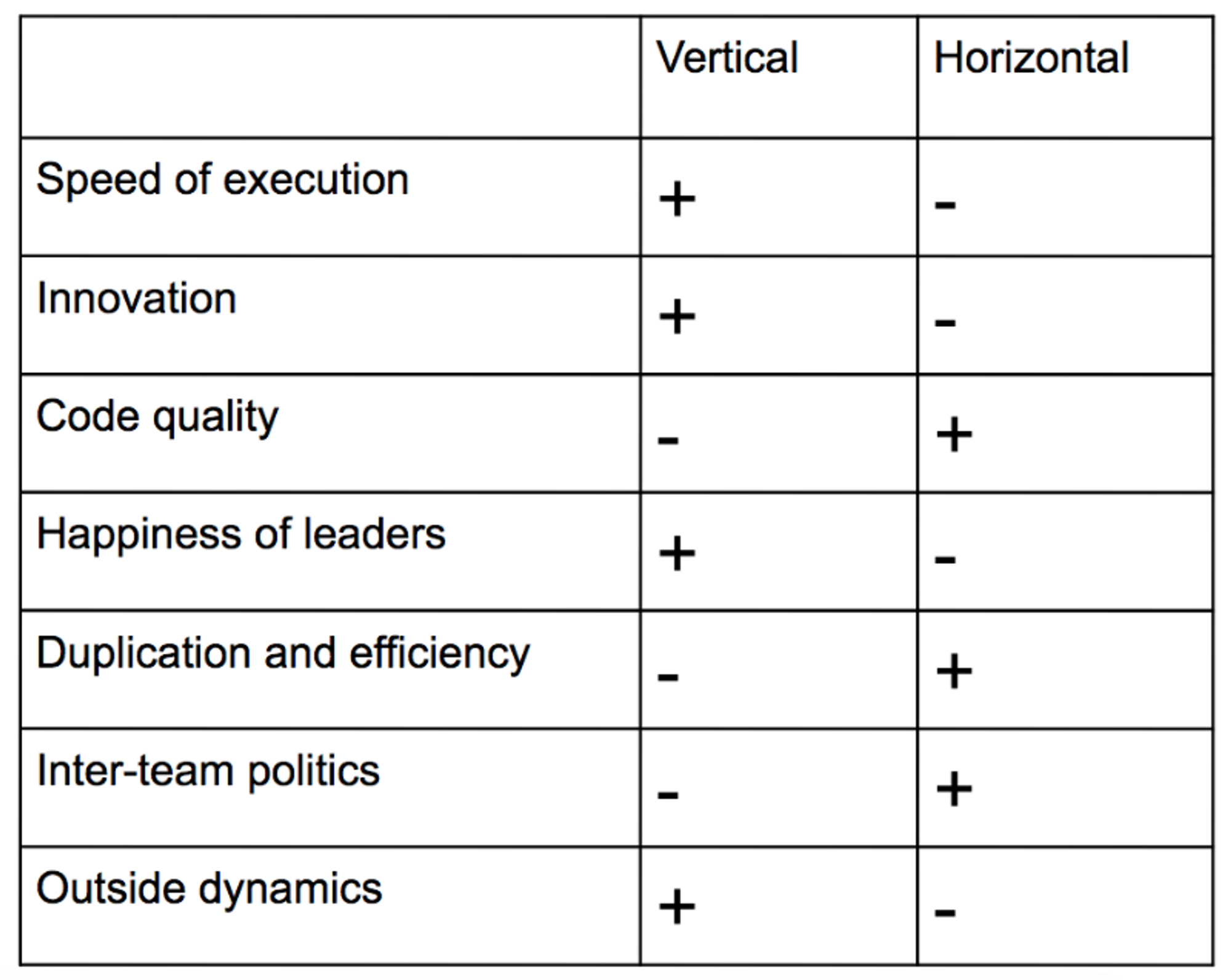 Generally speaking, vertically-integrated teams win when it comes to speed of execution or innovation. People are happier and external relationships are better simply because the team is more aligned with business objectives.