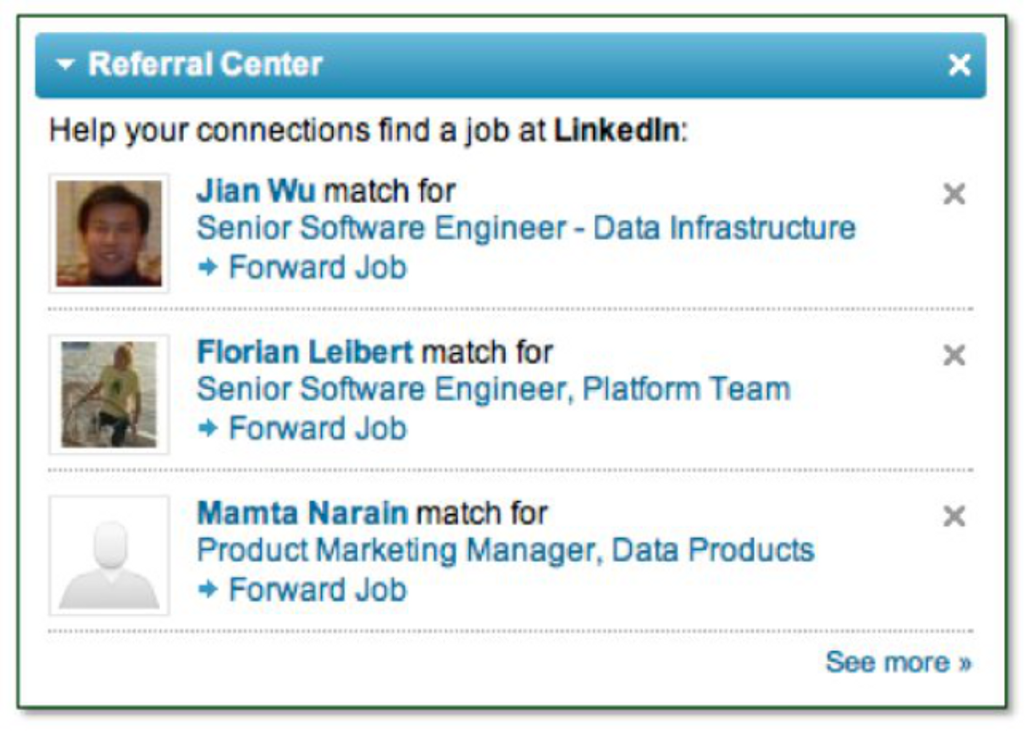 The clever solution in this case was to approach job recommendations from a different angle. If "Bill" is the user they are trying to reach, then instead of sending recommended job openings directly to Bill, they decided to send them to his network with the short note: Recommend Bill for this job. It used the exact same algorithm, but with a little twist, it took care of the hard relevancy problems.
