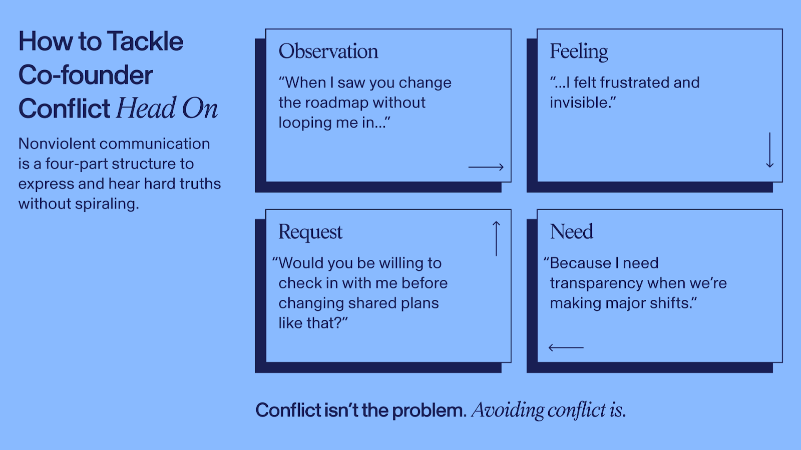 She likes to share the Nonviolent Communication (NVC) framework, initially developed by Marshall Rosenberg, with founders to give them some structure around sharing their feelings — without getting combative.