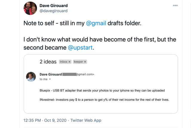 But for Girouard, behind the scenes, it was a sore spot. "Without question, fundraising was the hardest part of building Upstart, and I sucked at it. Still to this day, if I had to do it over, I'd probably still suck at it. It was the least fun part of my job," he says. "One of my early investors, David Weiden, thinks there's a strong, inverted relationship between building companies and fundraising. And he said to me, 'Dave, you're good at building companies. You're probably not very good at raising money.' And it was totally true. It was always a struggle, either because I didn't enjoy it, or because folks thought someone else was already the winner, or because the category sucked and they didn't want to put money into it. Just to be clear, the last time it was easy to raise money is when I raised a seed round while leaving Google in 2012."