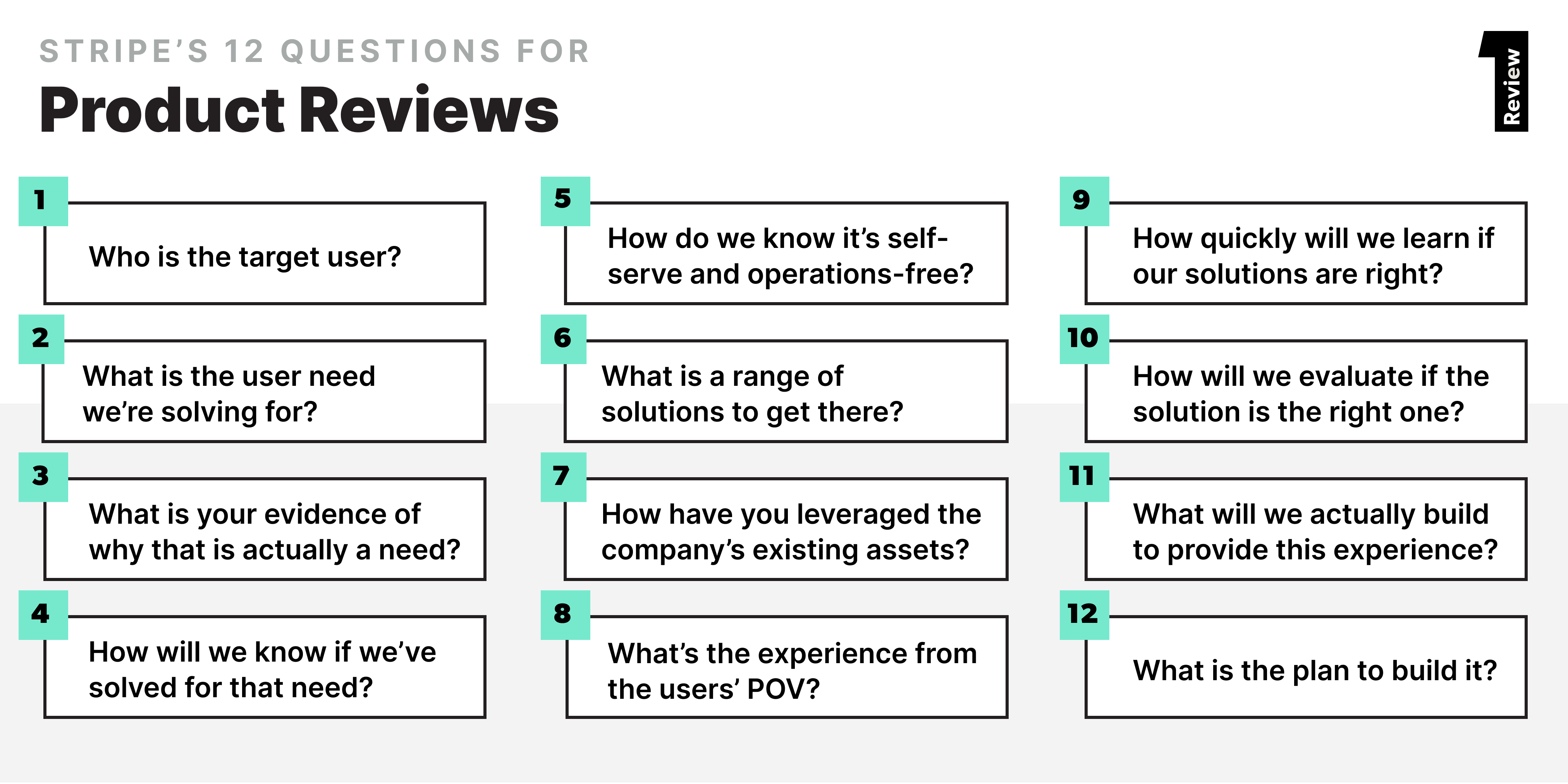 “Of course, there’s the QBR, which is an important tool and a bare minimum level of check-in. But Stripe would also do a monthly product review to dig into the details. Specifically, there is a set of 12 questions that Stripe leaders ask in every product review. And there's a very strict guidance that you cannot move on to question two until you've sufficiently answered question one,” she says. “You don’t get to all of the questions in every review. Sometimes a team will come in and say, ‘I've only answered four, or I answered one through six in the previous review, now let's get into the others.”