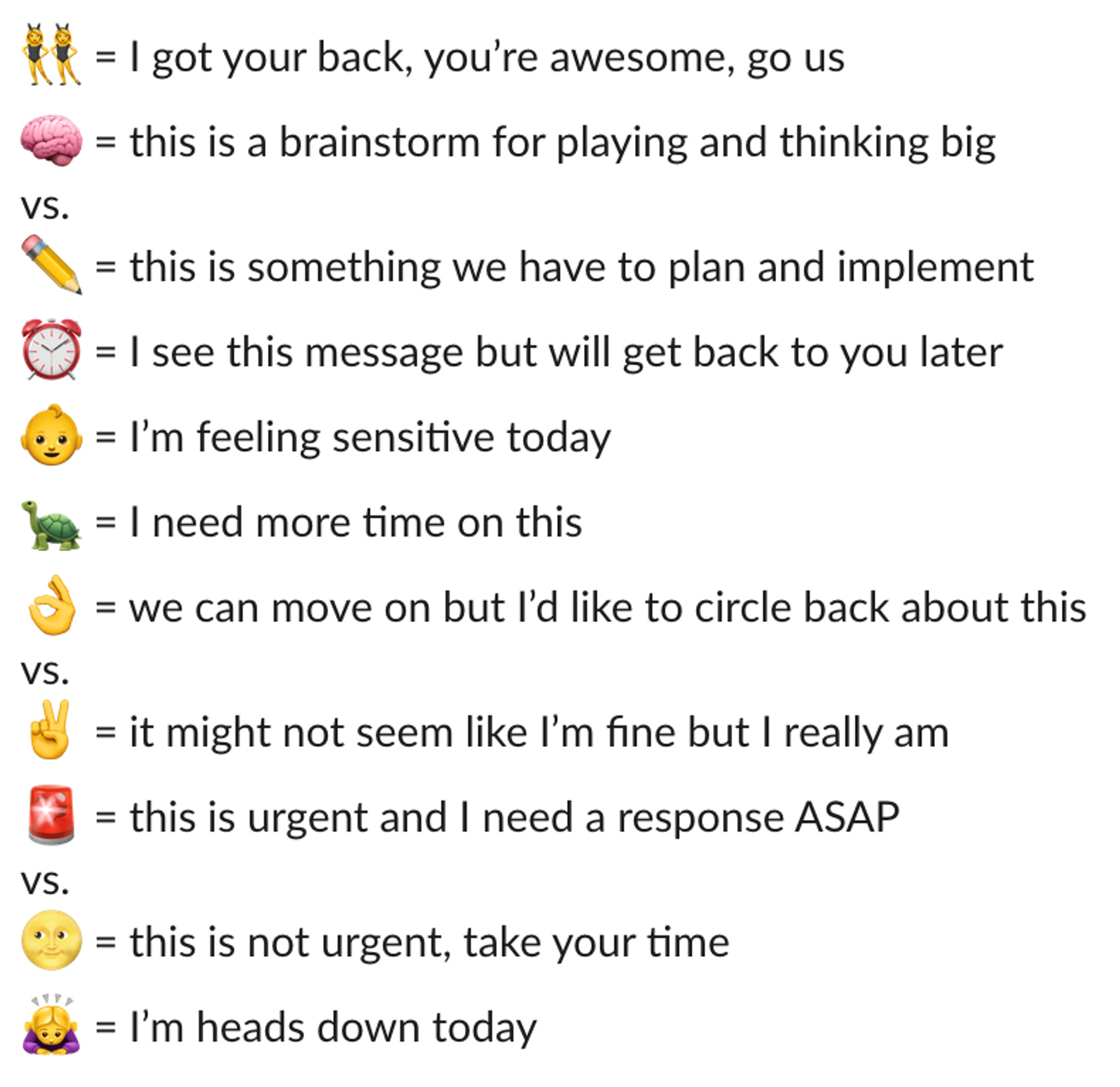 Within her own company, Anhalt and her co-founder have started using what they call “remojis” that are more conducive to remote communication, which can often feel tone deaf. “Choose emojis that represent emotions that are difficult to express, like ‘I’m feeling unhappy with this, but need time to think,’ ‘I’m in full support of this, I’ve got your back’ or ‘we’ve exhausted how much we can talk about this via Slack, let’s take this offline.’” Here are some examples of remojis that Anhalt uses with her co-founder: