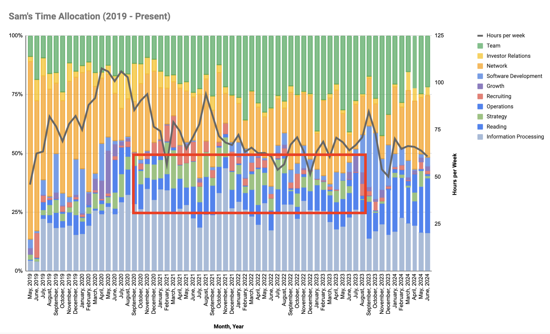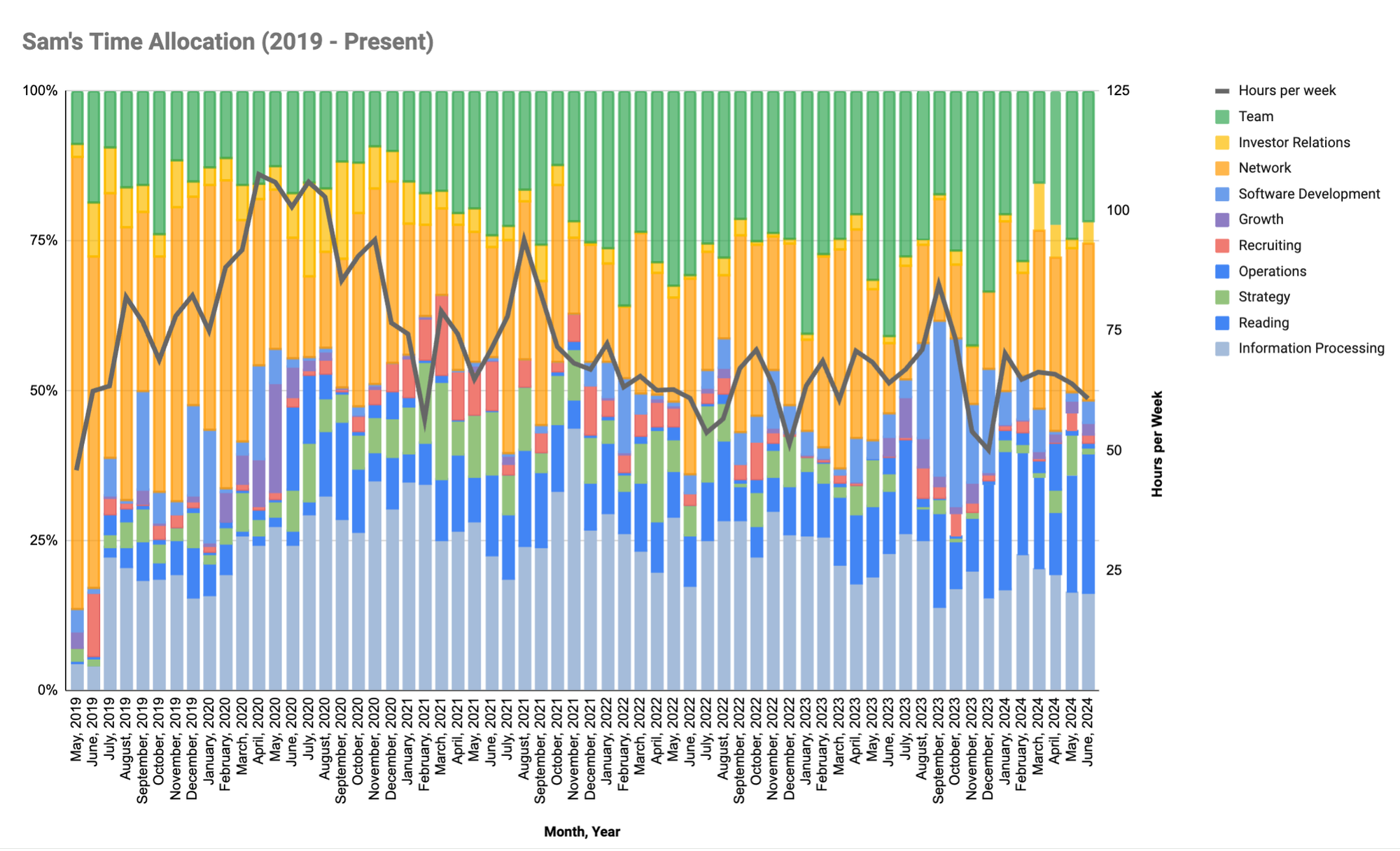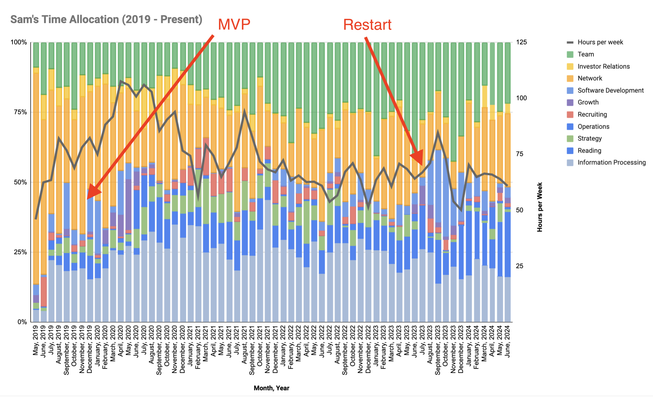 Before diving into the data, let’s get something on the table: Admittedly, I work a lot. During the peak of our seed round fundraising, I averaged 110 hours a week. I haven't had a single month in more than five years where I've worked fewer than 50 hours per week.