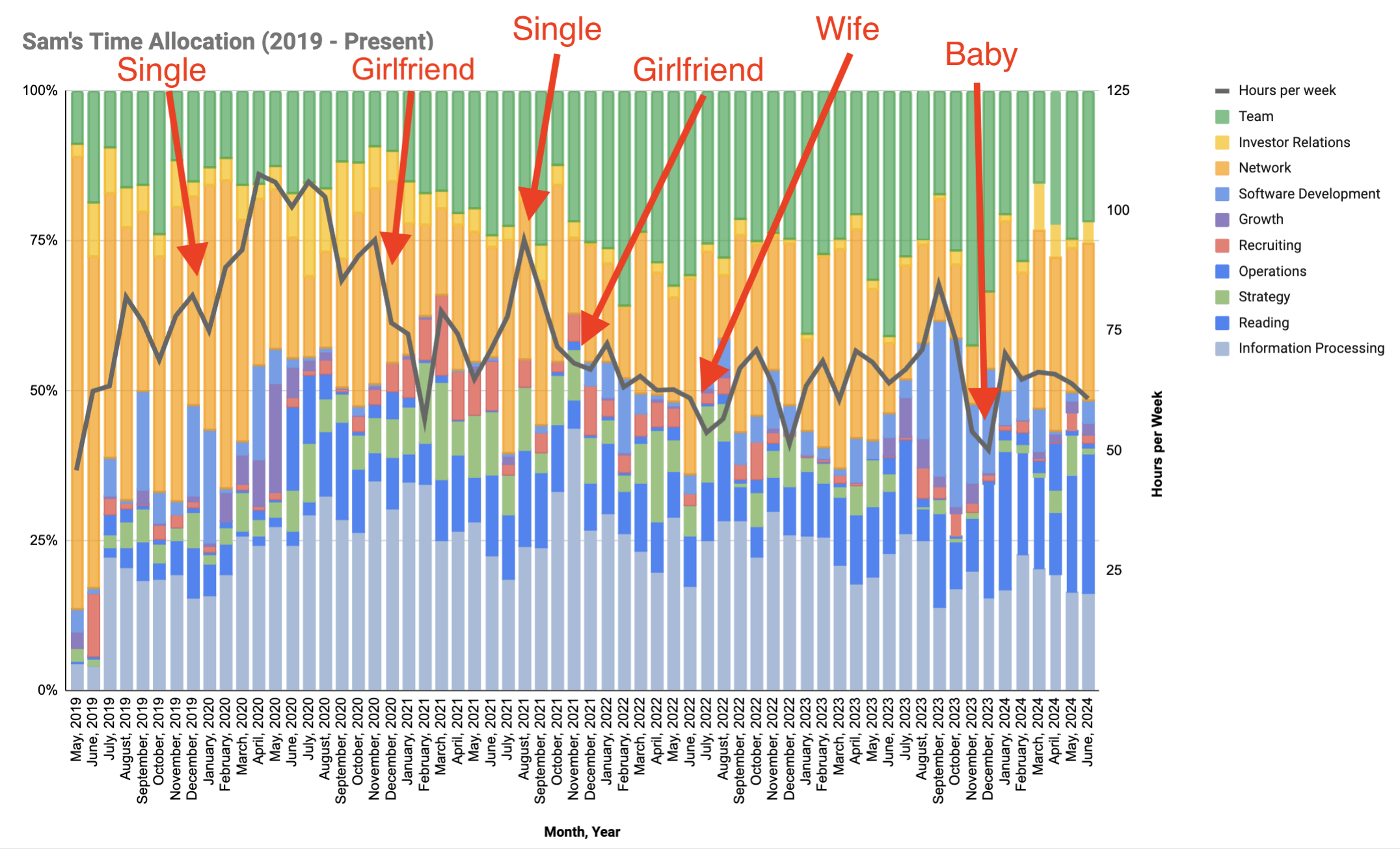 The numbers tell a clear story: When I was single, my working hours regularly stretched between 90 and 110 per week. That shifted to 50-70 hours when I got in a serious relationship, and has settled into a consistent 50-60 hours since becoming a father.
