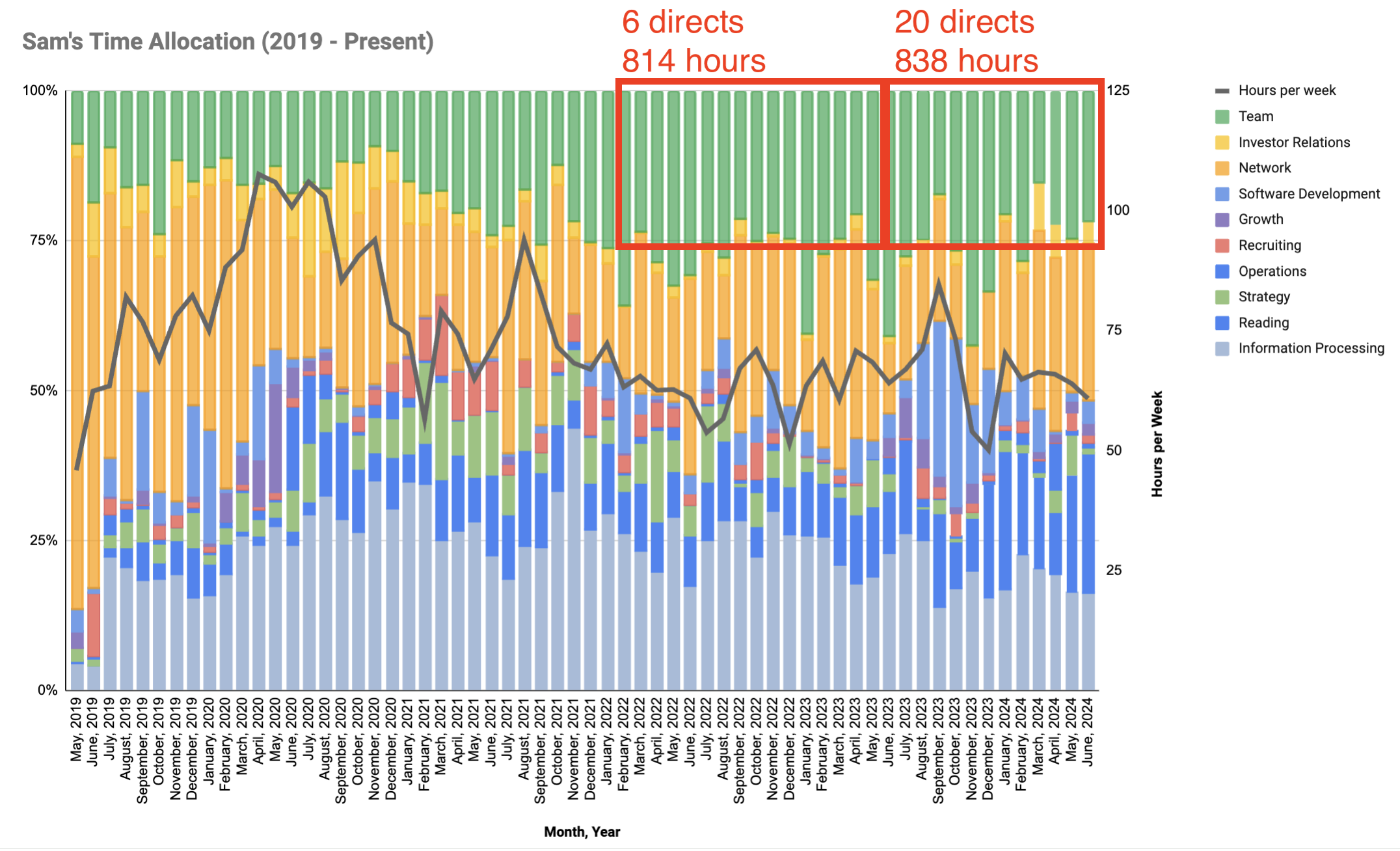 But the numbers tell a different story. Take team management, for instance: Even with triple the number of direct reports, the time allocation in this bucket barely budged year over year.