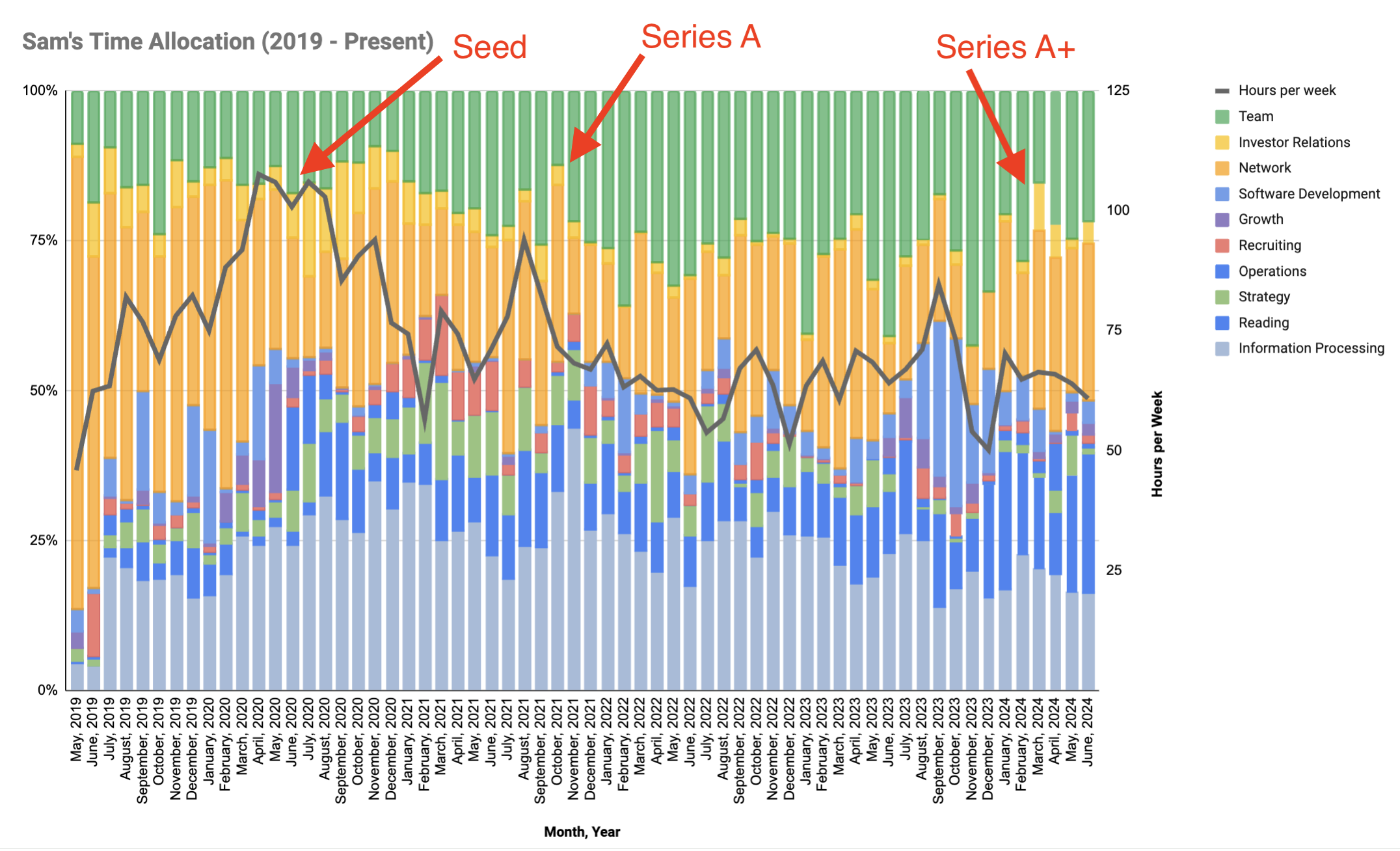 Since that checkpoint, we’ve raised both a Series A and an opportunistic Series A extension, neither of which completely took over my calendar in the same way the Seed round did. Both were only about 15% of my time, I was spending far more on sales and operations.