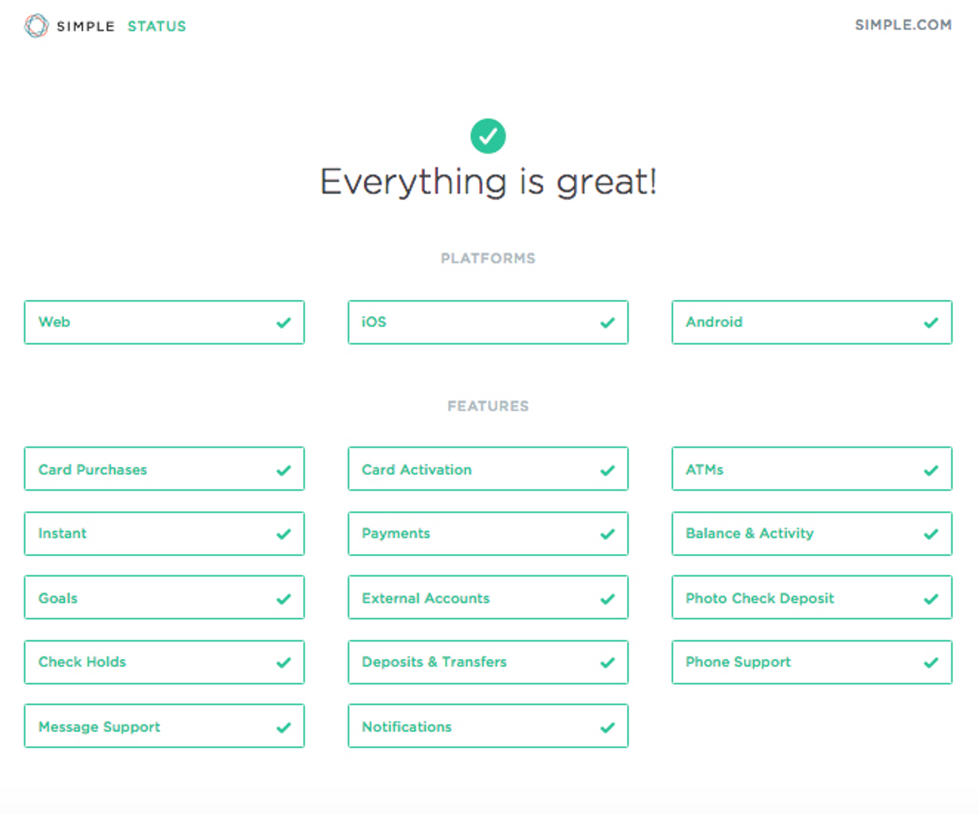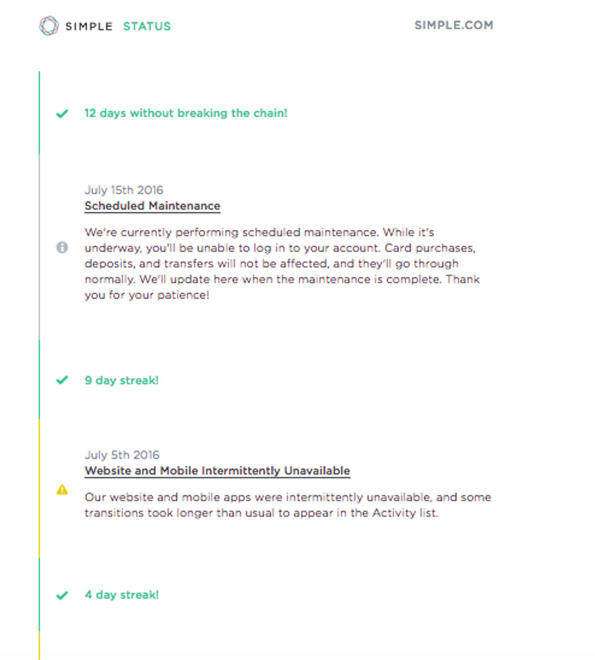 The status page also serves as a running log of past incidents. They are not swept under the carpet, but shown on a feed. Any scheduled maintenance also appears here to alert Simple’s customers of any interruptions in service in advance.