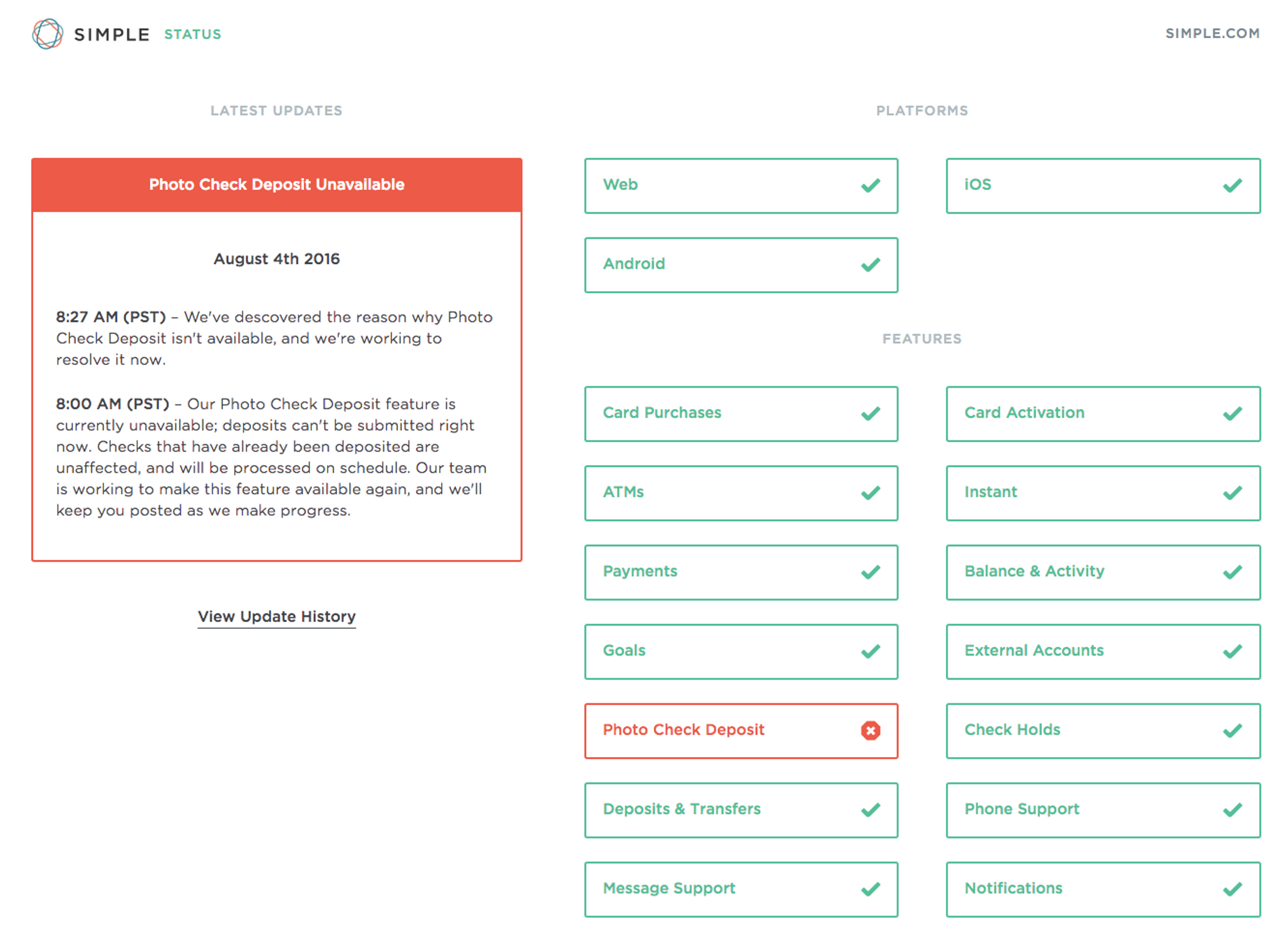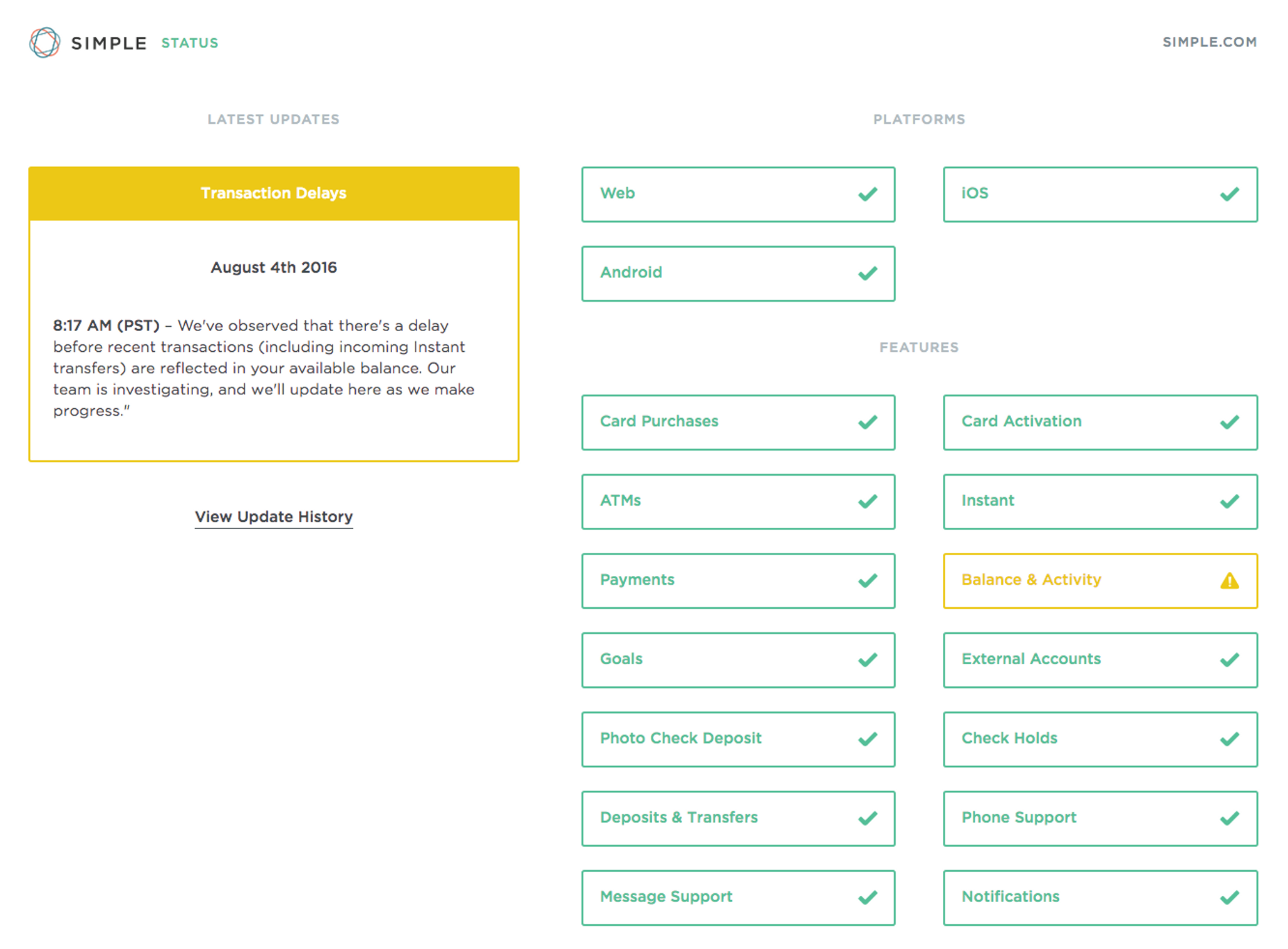 Now when an incident is flagged due to interrupted service — say a slowdown with instant transfers or 10-minute glitch in photo check deposits — the feature’s indicator is changed to yellow or red, depending on severity. More than creating an efficient system, the status page elevates Simple’s quest to strengthen and return trust. “On a grander scale, our vision is to create a self-driving bank account. So fundamentally, if a customer can't answer her own question, then we have a problem. “Being able to see when a service was last offline and check its current function builds trust. We believe your money is yours, you shouldn’t need to call us to answer basic questions. We’ll never stop working to continue earning our customers’ trust.”