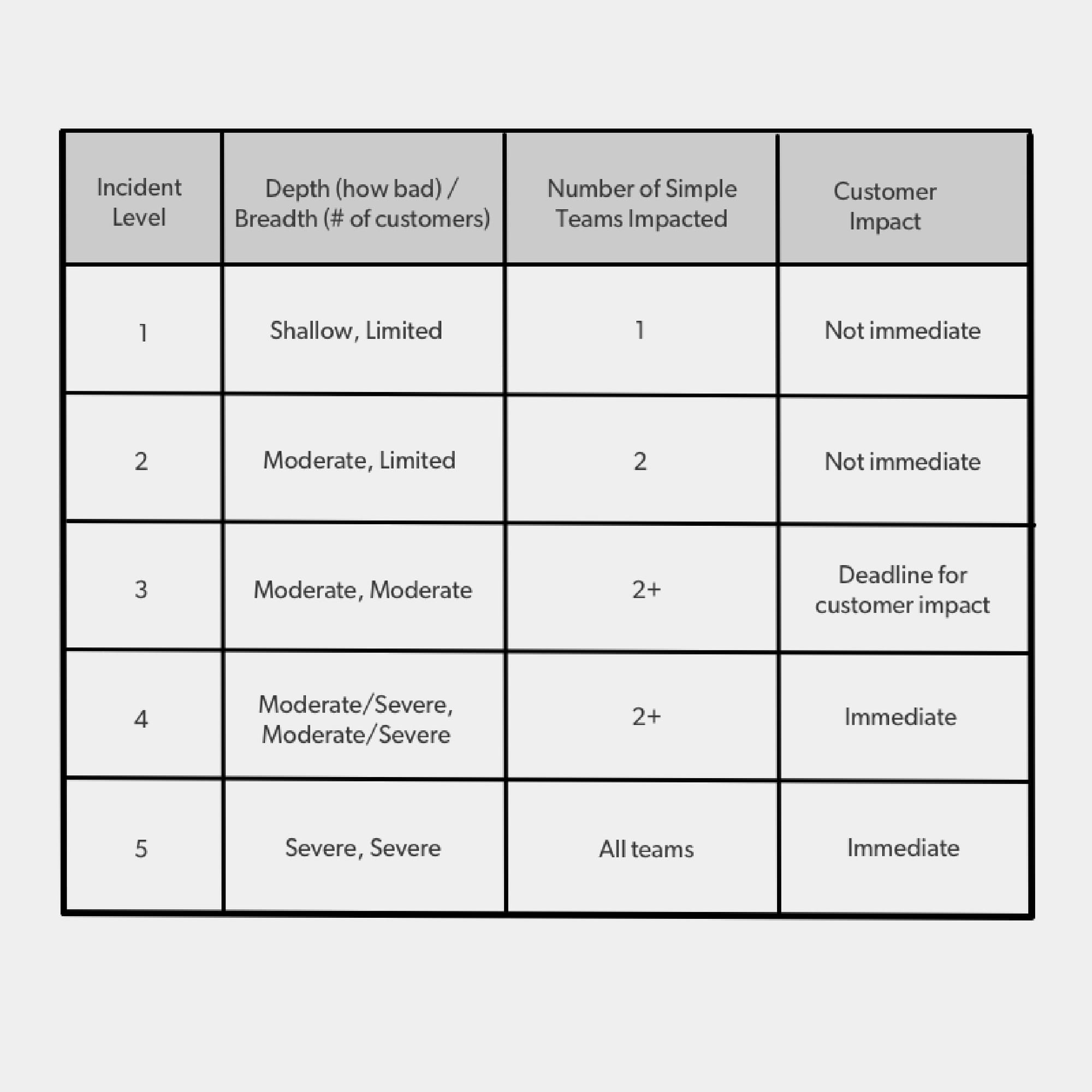 Simple also uses a risk classification framework to diagnosis the severity of an issue and the resources it should supply to fix it. It supplements the four questions by helping to measure the potential damage after an incident occurs. “Any incident can be translated into five tiers of severity. It's all about a company knowing and understanding their priorities and what matters in times of urgency,” says Berlincourt. “For Simple, we consider how many internal teams are impacted and customer impact, above all else. We also consider internal impacts and if our external partners need to be kept in the loop.”