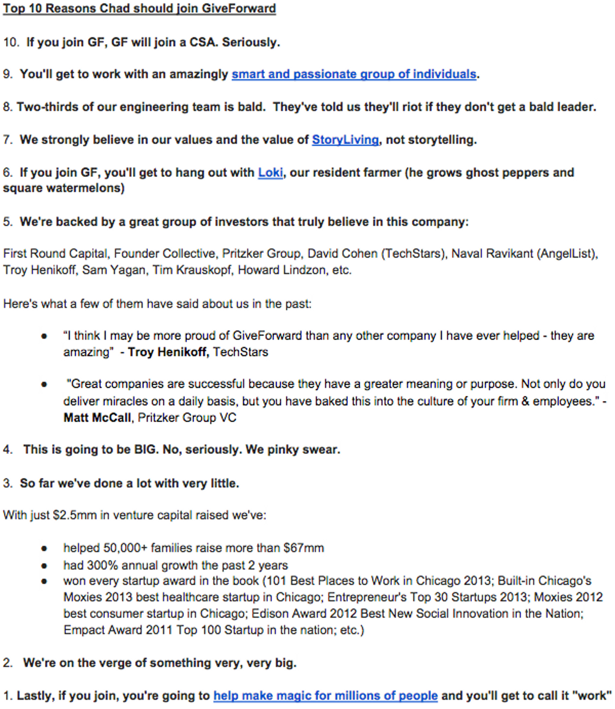 - Illustrate your values and mantras: In the case of GiveForward, it wanted to convey its core value of “authenticity” and its internal mantra of “weird is good.” Here’s a few ways how: “It would be mucho bueno if you had all of the above. Of course we recognize that this is a long list [of requirements] and you will not have all of these skills. You should apply anyway. This is going to be transformational. We pinky swear.”
