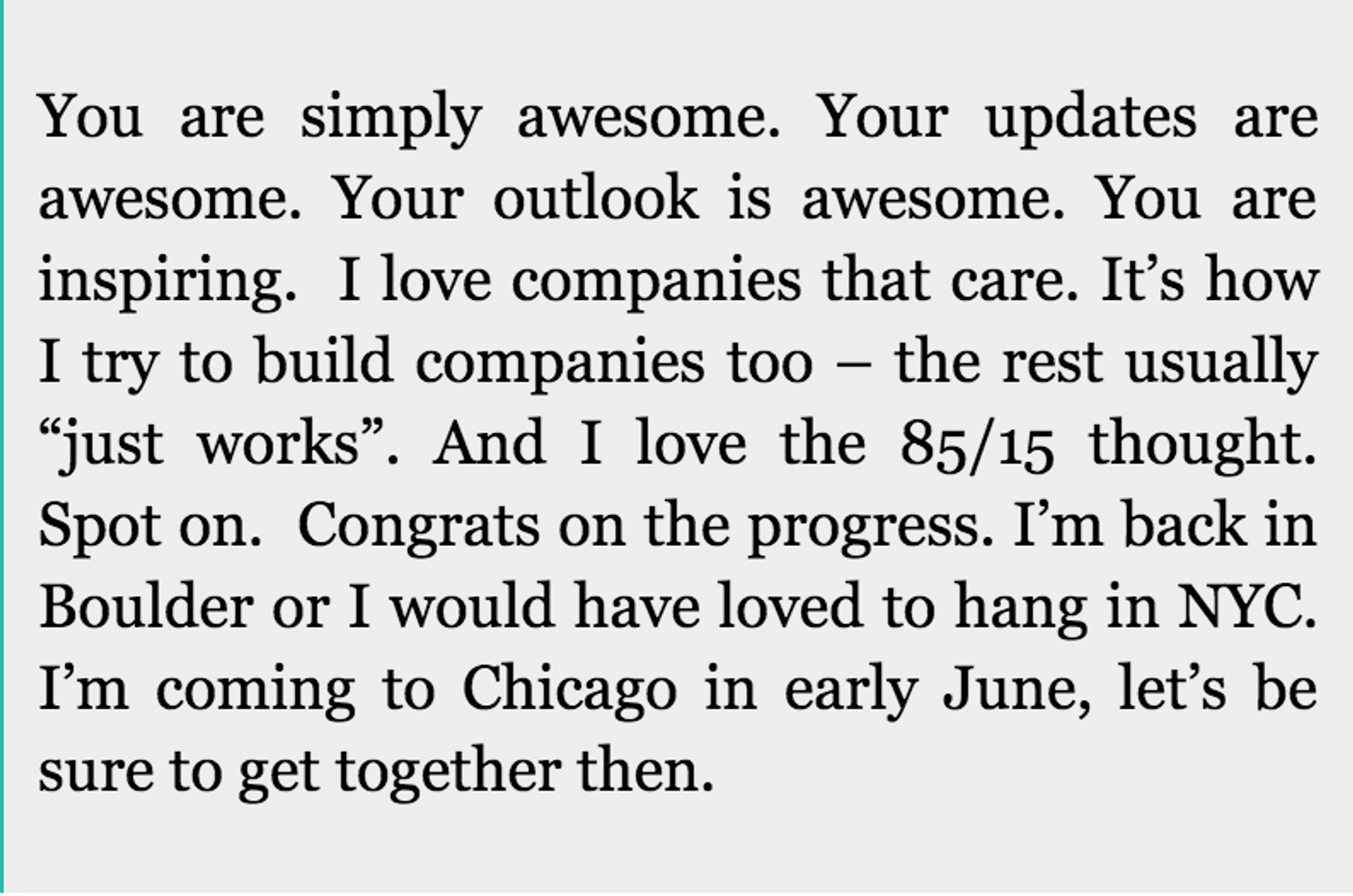 ...and soon similar feedback from the other investors rolled in. “For us it was such a boost to confirm that we had investors that embraced our weirdness and rewarded our authenticity — basically, synced with our cultural values,” says Austin. “That gave us the confidence to build the company and culture the way we wanted to create it without being second guessed."