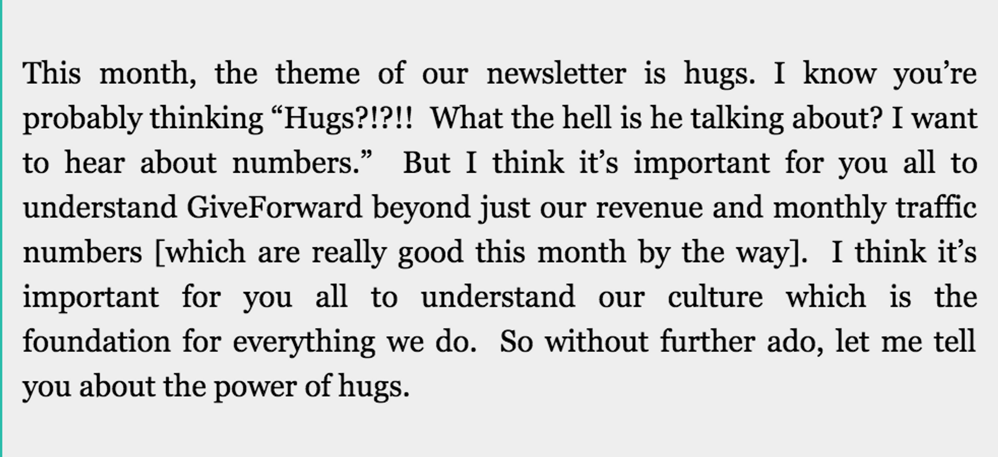 Three months after GiveForward closed the round, Austin wrote one of GiveForward’s first investor updates, which he titled ‘The Power of Hugs.’ The email recipients included a billionaire, a successful executive whose name is on a business school building at the University of Chicago, a founder with an IPO under his belt and a few other serial entrepreneurs. “I was terrified about sending it out because I thought I’d get laughed out of the room. Was I really going to send a note about hugs to these seasoned investors and founders?” says Austin. “I mustered up the courage to hit the send button and hid under a desk hoping that I didn’t just end my career.”