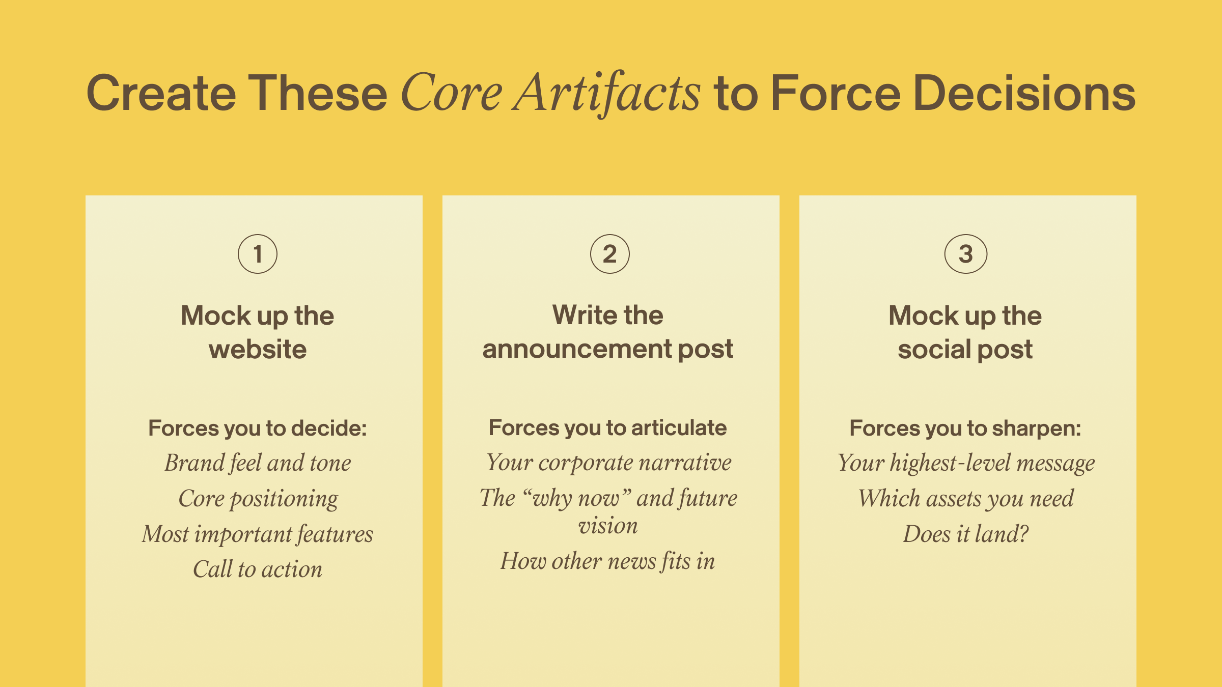 Here, she lays out all the fundamentals you’ll need to nail down before launch. But heed this reminder as you craft your strategy: “The prep work can be more impactful than the launch itself,” she says. Obviously, you want your launch to win the attention of potential customers, investors and random people on LinkedIn, and her plan of action will help increase those odds. But most of the homework she assigns below is a forcing function for the crucial positioning and product decisions you need to make right now — even if your kinda-cringe tweet draft never sees the light of day.