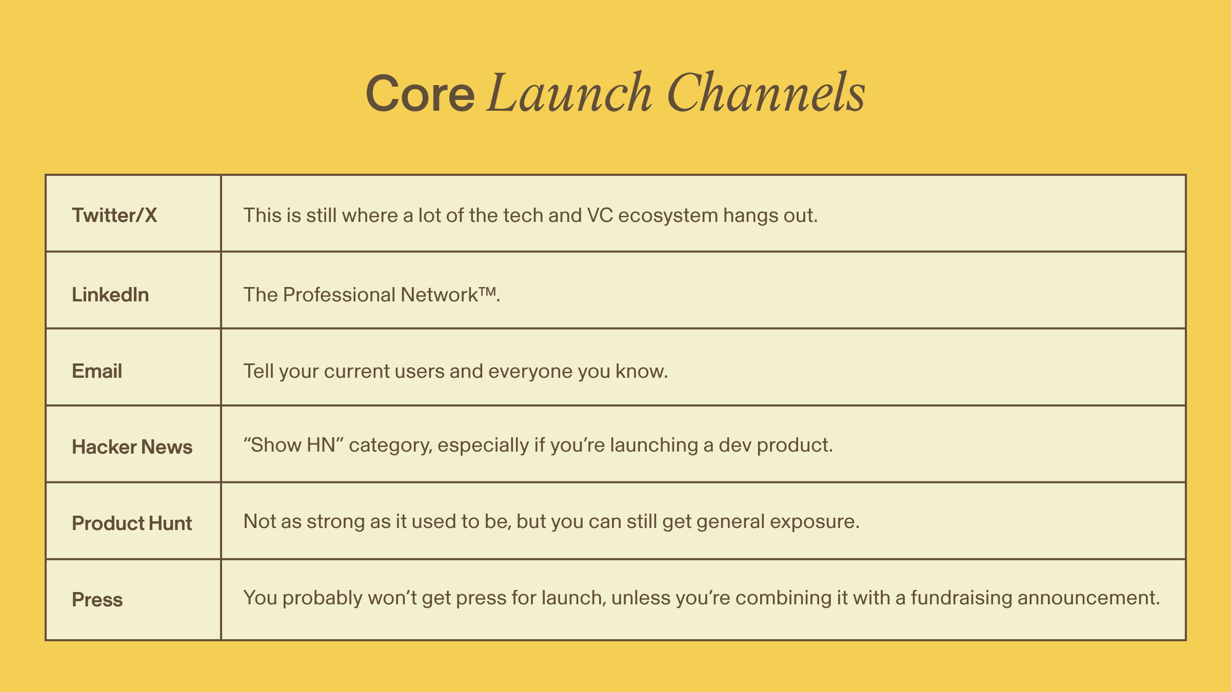 There’s a general launch channel playbook that will serve most tech founders. “But yours might be different depending on your ICP,” says Butler. “Remember that there are two audiences of your launch: Your target customers and the tech ecosystem, which sometimes live on different channels. And you need to share your news with both.”