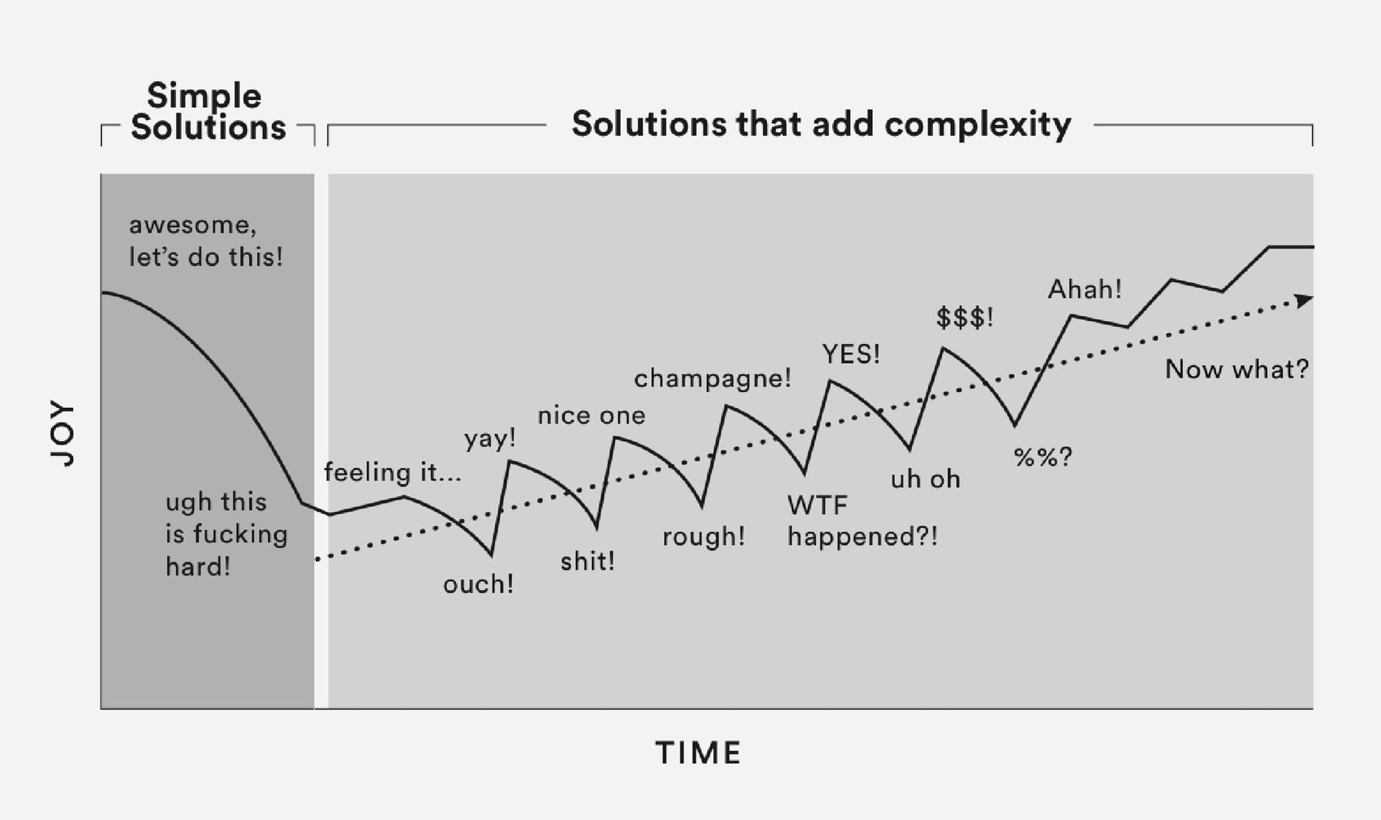 The honeymoon phase at the start of a venture is known not only for its boundless energy but also its remarkable clarity. In the beginning of your journey, simple solutions come easily. But as the middle becomes volatile and more problematic, we have the tendency to add complexity. We solve problems by adding more options, more features, and more nuances to our creations.