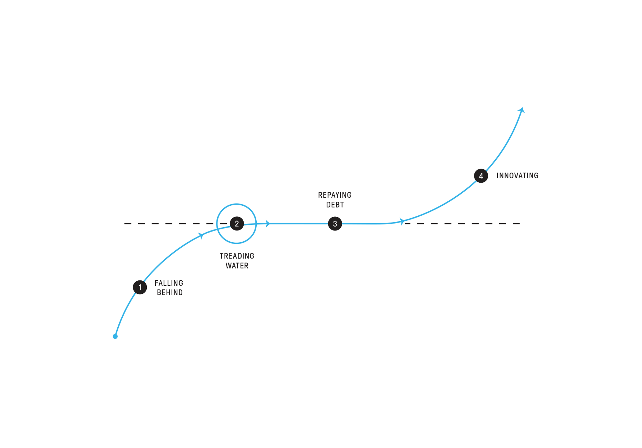 - 2. When the team is treading water, the system fix is to consolidate the team’s efforts to finish more things, and to reduce concurrent work until they’re able to begin repaying debt (e.g., limit work in progress). Tactically, the focus here is on helping people transition from a personal view of productivity to a team view.