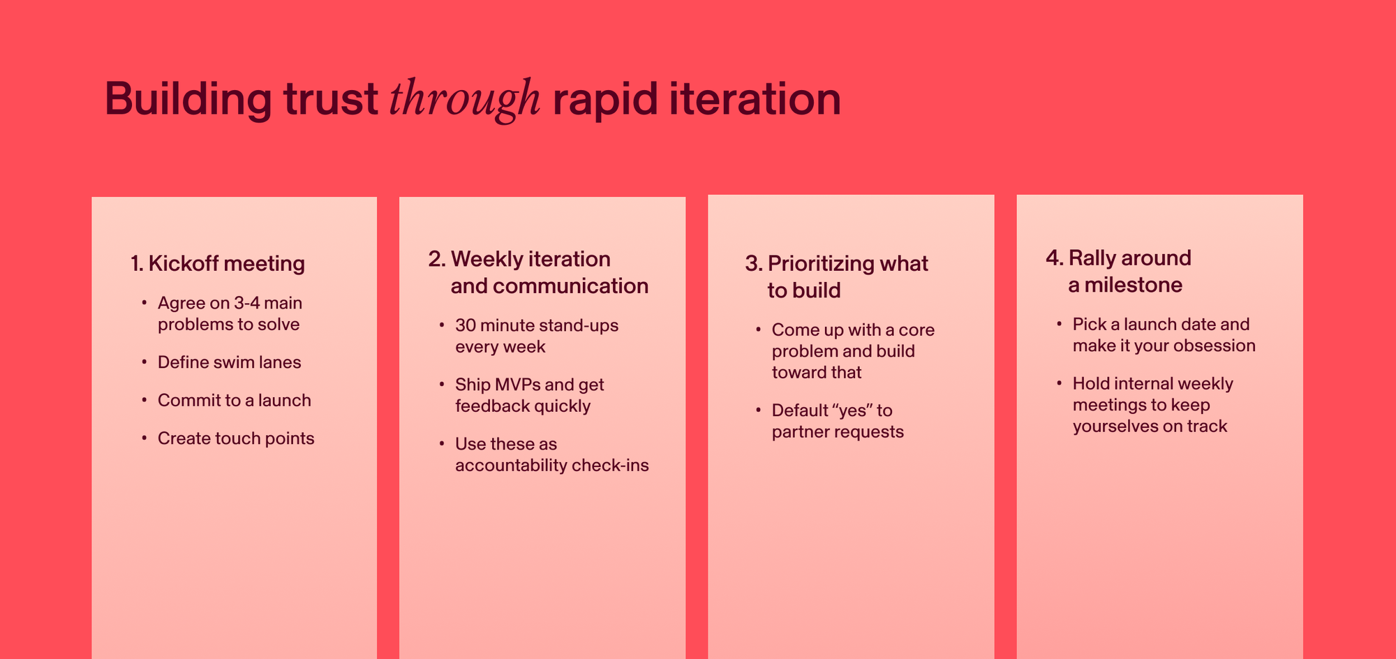 - Bring your partners in early so you can build the product together — not at the end when everything’s almost done.