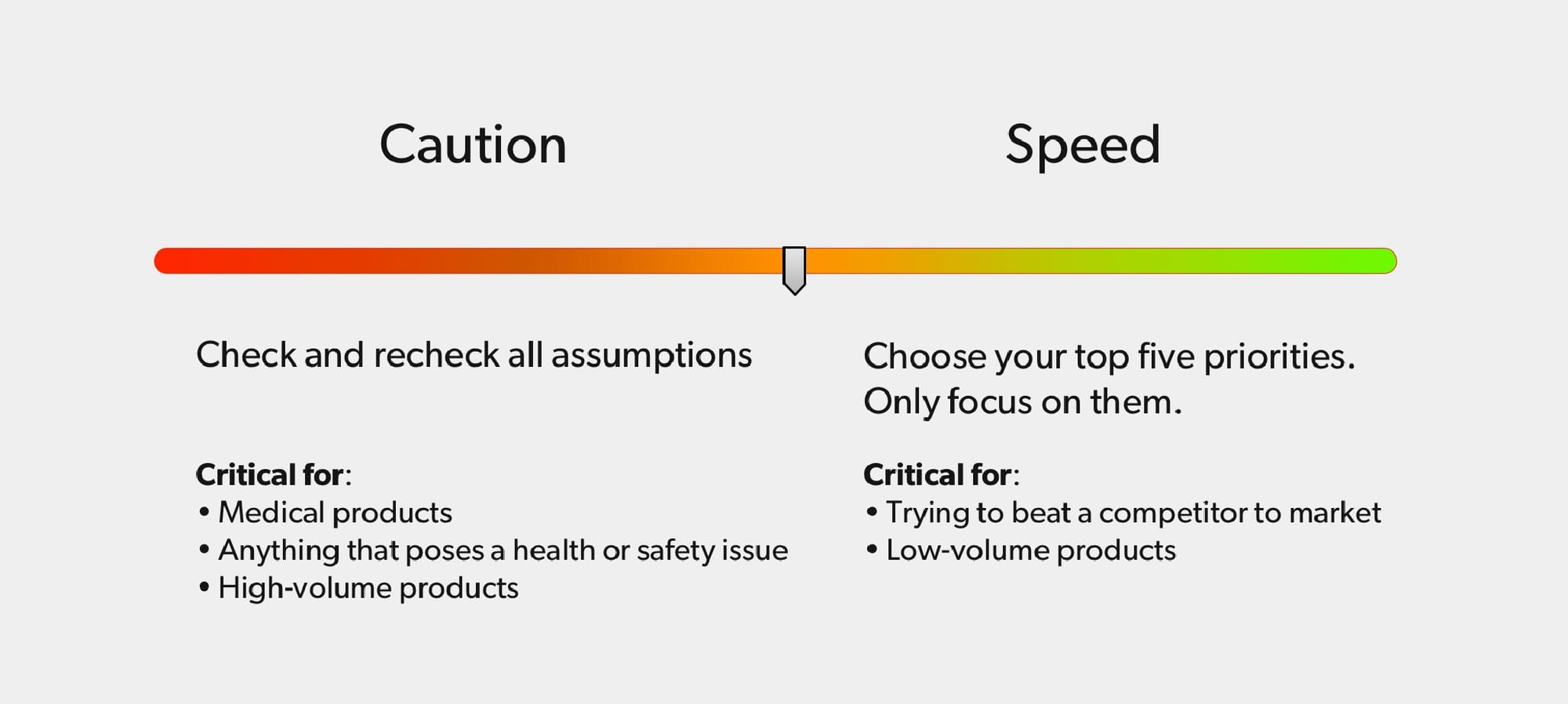 Your management of your team should also shift accordingly. “If you’re super cautious, encourage all assumptions to be checked and double checked. Say to the team, ‘Confront each other.’ Ask, ‘Is this true? Is there enough swell space for the battery? Is this flame rating correct for this part? Are you sure? Have we tested it? Have we sent the part out to a third party and verified it? Three months into the product run, will we re-verify that the manufacturer hasn’t changed the material on us to lower their costs?’” Kalinowski says. “When speed is the top concern, only worry about the most critical issues. In those cases, I give a piece of paper to my people and say, ‘Make a list of all the design issues you are worried about in ranked order.’ Then I rip the page under their first five and hand the top part of the page back to them and say, ‘just focus on those.’’”