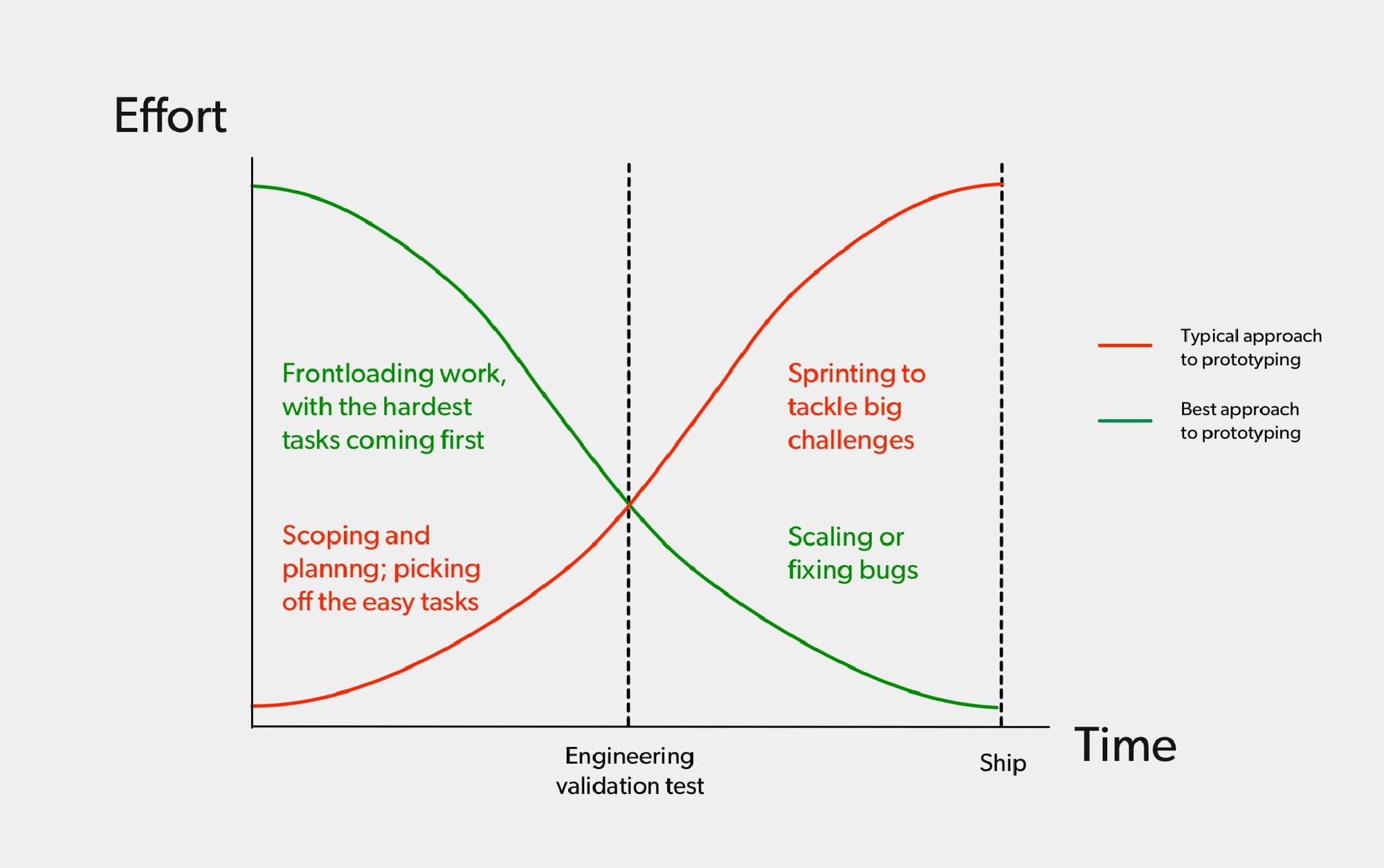 First, frontload. Pile on the effort and focus at the beginning of your journey. “My former colleague Doug Field, who was a VP at Apple and now runs engineering at Tesla, had a very useful graph of how to think about design effort. Most people increase their effort and focus as the product develops and they find issues they need to fix or address, peaking at the moment right before you ship. Although this is sometimes unavoidable, this is not what you want to do. Making changes at the end of development is far more difficult, dangerous and costly than in the beginning,” Kalinowski says. “By the EVT [engineering validation test], your goal is to basically be done. Often it’s very difficult to achieve this, but it’s a good goal. If you have to fix major design issues after EVT, you'll have diminishing returns on your efforts. Ideally, the phases after EVT are a scaling operation in hardware or bug fixes in software. You won’t have much ability to make big changes after this point without causing risk. Focus your effort towards the beginning, where you can squeeze in as many iterations and changes as possible. Go through crazy amounts of work right here. Put the best people on it. Do all of your grinding here.”