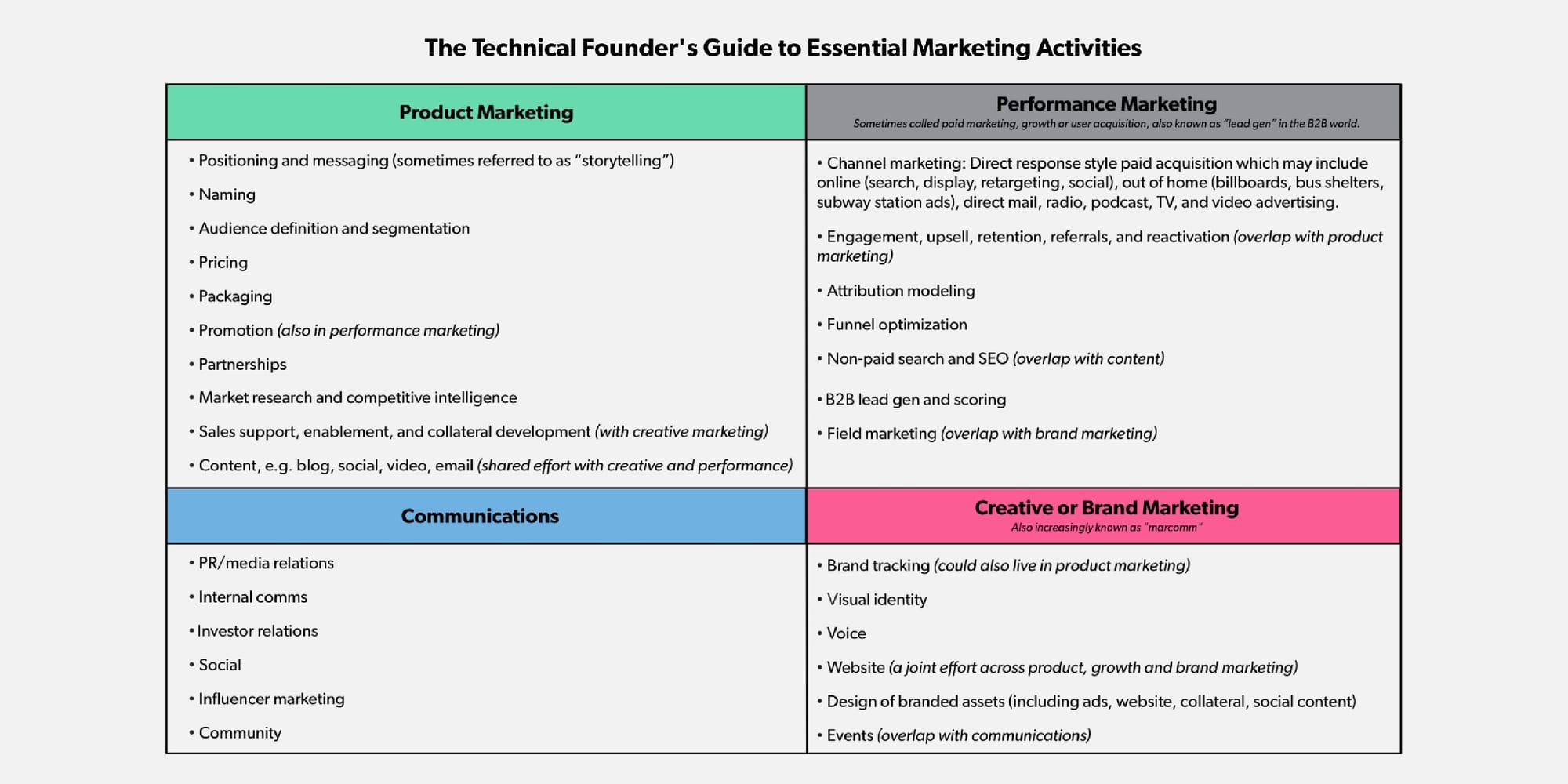 To provide a quick crash course that helps founders narrow in on the particular flavor their startup needs, Jackson organizes essential marketing work into four main groups (noting areas of overlap):