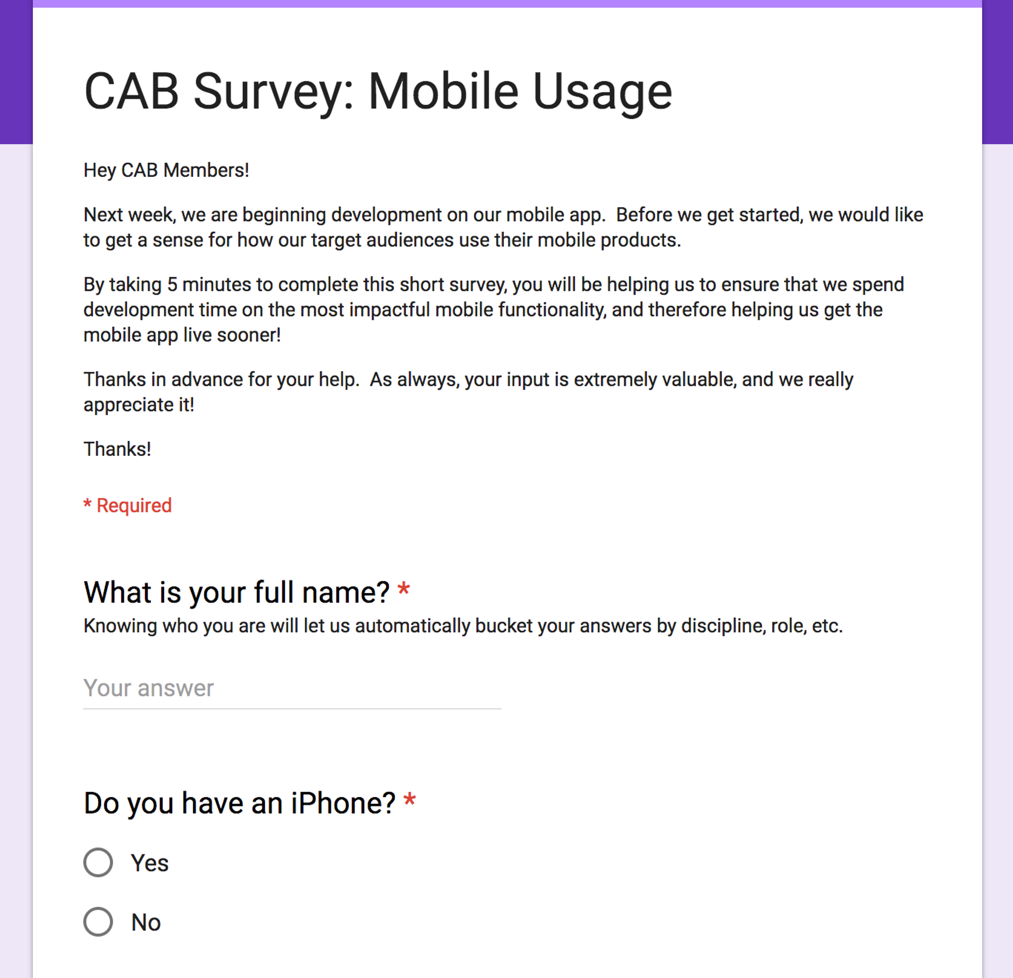 Don't shy away from sending one-question surveys. They're even easier for people to fill out, will keep you engaged at a regular cadence with the group, and can tell you a lot. “In our case, when we were thinking through our mobile app, we sent out an email that asked only, 'Can you tell us what OS you use on your phone?' Our strategy was based on a guess that there wasn't substantial iPhone dominance in our target market and we might have to do an iPhone and android app to start — but it turned out there was a huge weight towards iPhones, so we focused our dev resources there,” Kazanjy says.