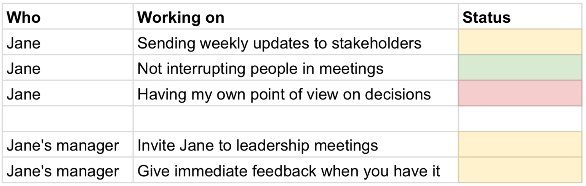 Previously on The Review, Lenny Rachitsky shared his performance reviews system that’s chock-full of advice for making the dreaded process more impactful than painful. The key to his approach? Following up those annual reviews with monthly touchpoints. “After the performance review conversation, turn each of the feedback items into a tactical action plan your report can concretely work on. Then, like any project, check in on how they're progressing and share advice, coaching and guidance along the way.” Here’s a template you can use: