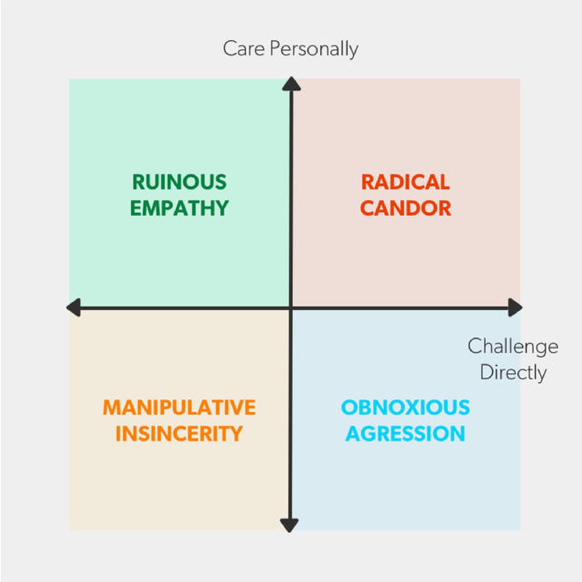 If the vertical axis is caring personally and the horizontal axis is challenging directly, you want your feedback to fall in the upper right-hand quadrant. That’s where Radical Candor lives. It's the combination of caring a great deal and being willing to deliver difficult feedback, Scott said. “Radical candor is humble, it’s helpful, it’s immediate, it’s in person — in private if it’s criticism and in public if it’s praise — and it doesn’t personalize.”