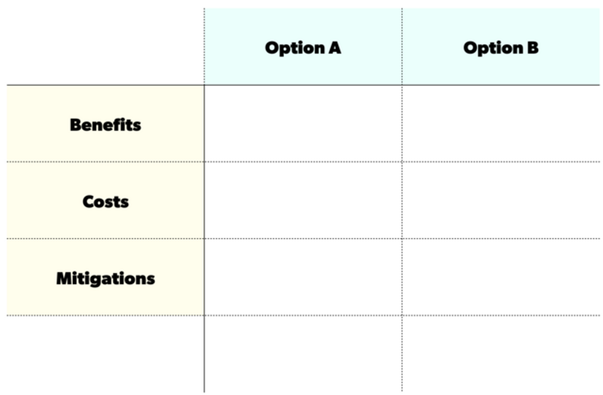It starts with a basic chart, with the two (or more) options you’re deciding between at the top. Down the left-hand column, you have benefits, costs, and — uniquely — mitigations.