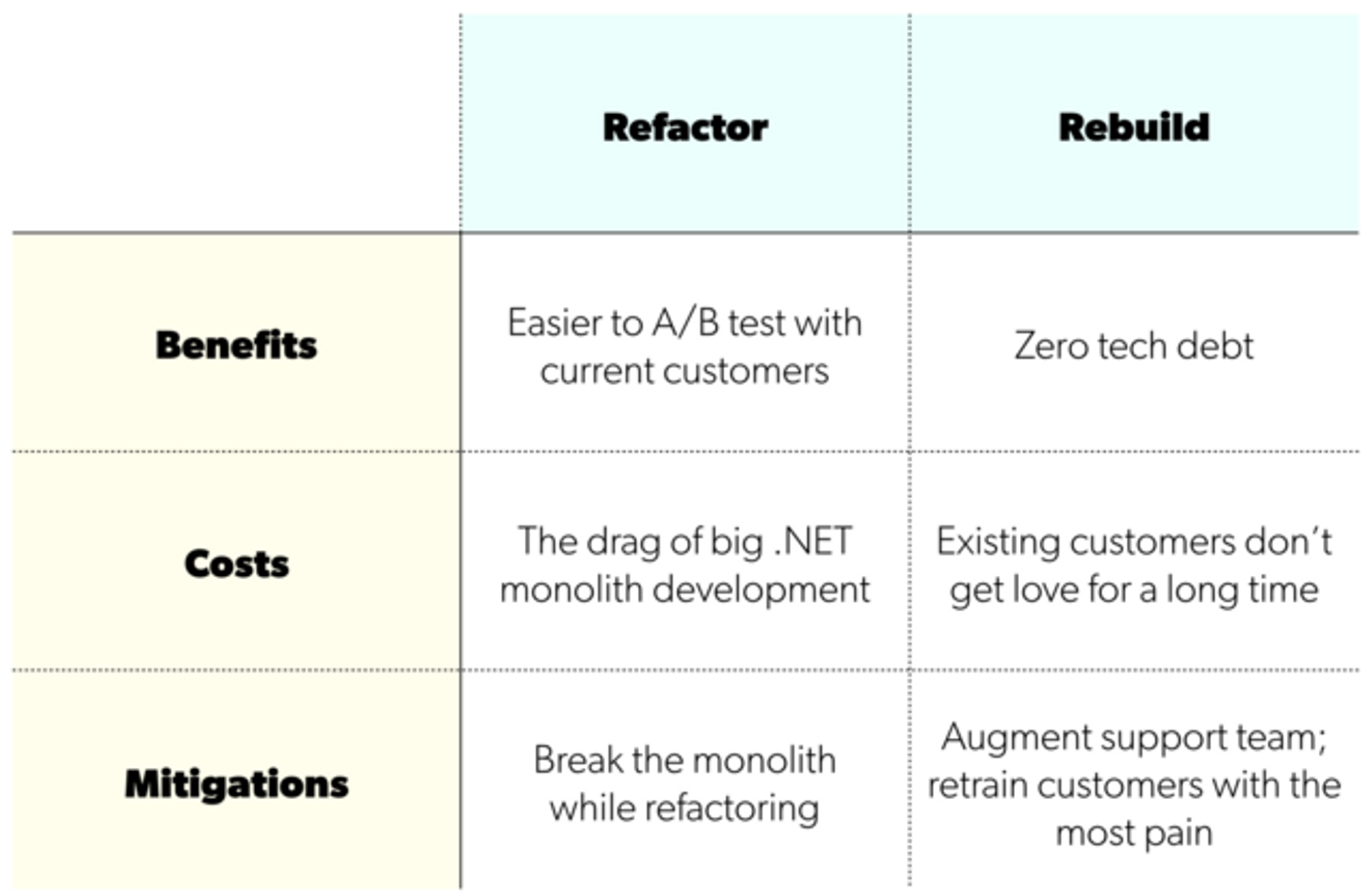 As an example, Flatiron recently had to decide whether to refactor a piece of billing software used by a small subset of its users — the other option was to rebuild a similar product from scratch. Here's how their matrix turned out: