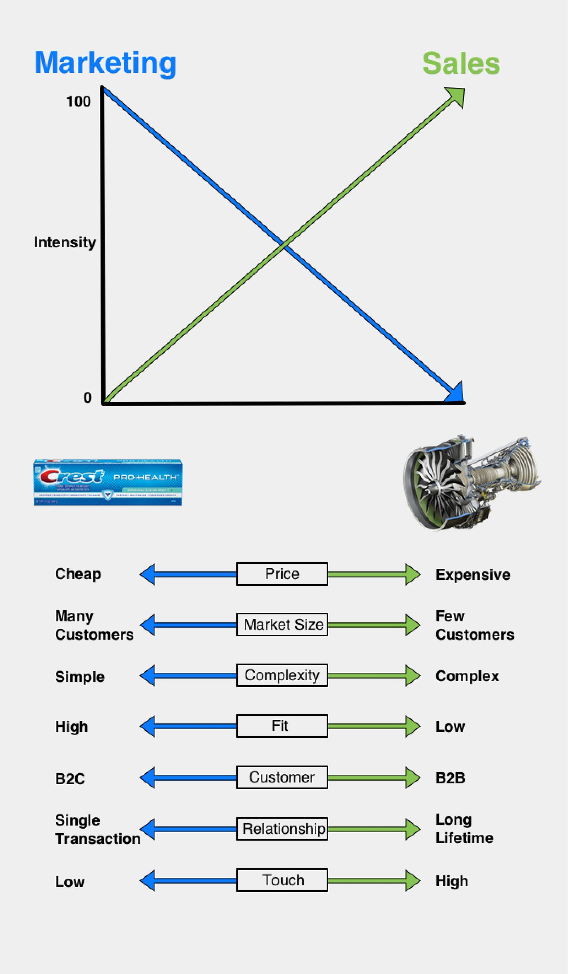 The more profound way to look at one’s go-to-market strategy is to identify where your company lands on the spectrum for each of those seven variables (see chart below). Each extreme is illustrated by a product: toothpaste is a marketing heavy product and a jet engine is a sales heavy product.