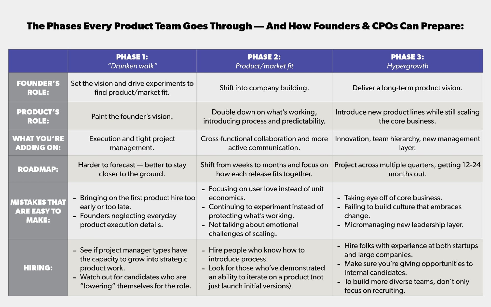 In a masterclass on building product teams, Singhal shares plenty of advice on pitfalls to avoid, who to hire and what the founder’s versus product leader's role should be in every stage, from what he calls the “drunken walk” of the early years to throes of hypergrowth. (He also provides an excellent definition of product/market fit that’s well worth your time.) But perhaps most helpful is this handy chart that summarizes everything neatly: