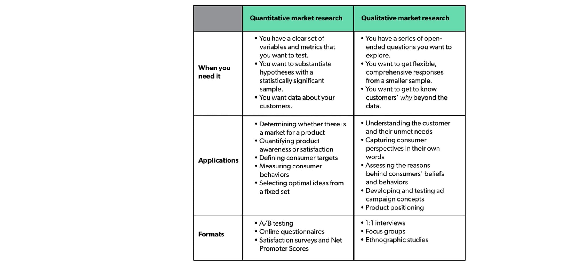 Qualitative research is exploratory and deals in emotions, so it seems squishy and easier to write off. But startups do that at their own peril, says Jesse Caesar, an independent researcher who cut his teeth working with PepsiCo and Amazon. “We build better products and solve bigger problems when we keep real people in mind, and you just can’t get that without qual. When it comes to market research, quant can only tell you so much. Data without insight is deadweight.” That’s not to say quant doesn’t have its moments. Both are valuable lenses into the product and the market, but they’re tools that do fundamentally different things. Given that founders often aren’t sure which to use when, Caesar offers up his guide for selecting the right one: