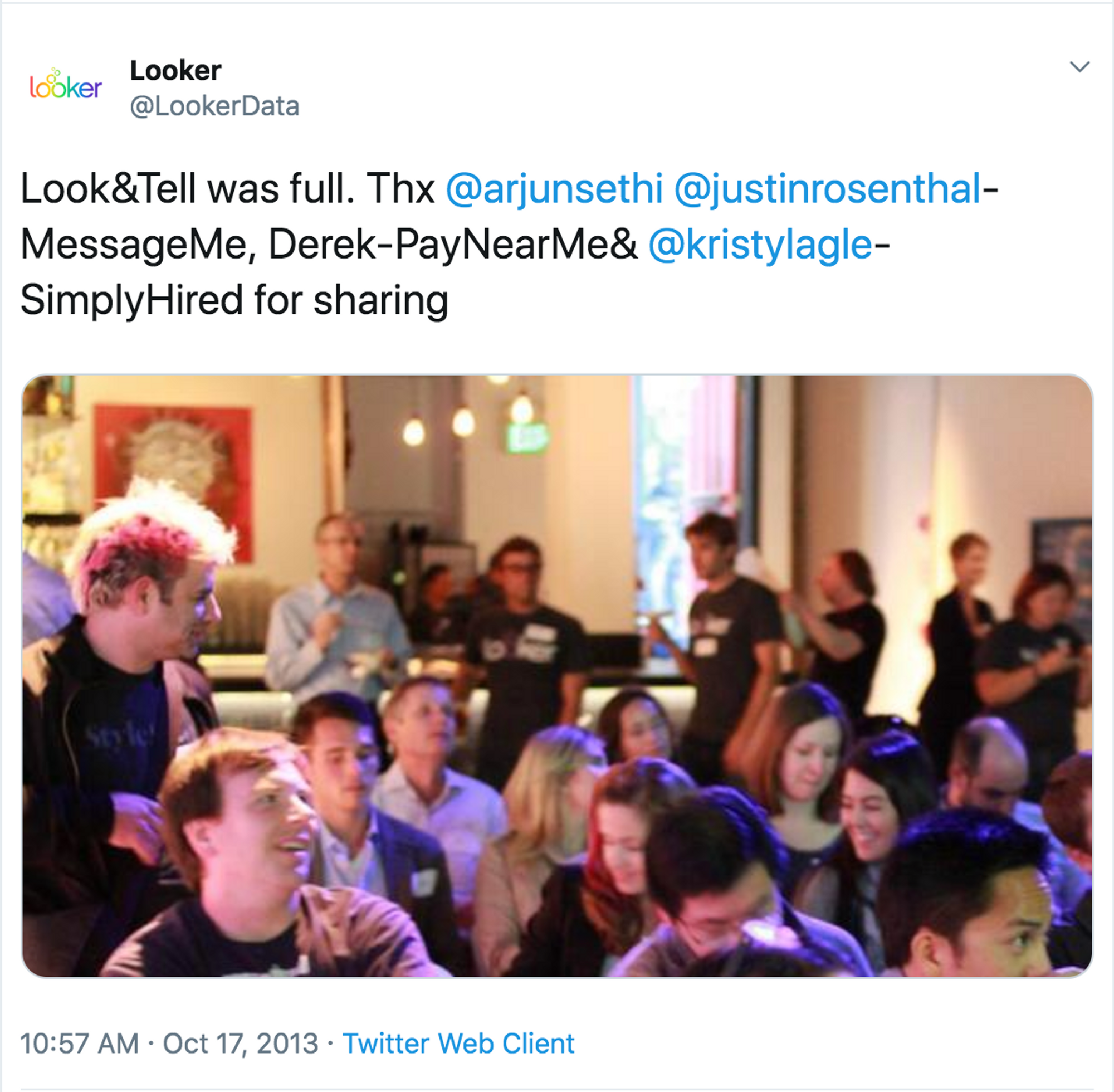 To surface stories exactly like these — and leverage them in the sales process — Looker turned to customer events. “This was Pam Smith’s brainchild, she was a critical marketing advisor for us in the early days,” says Tabb. “She told me to get our existing customers together for a ‘Look and Tell’ event with our prospects so they could do the heavy lifting on selling Looker.”