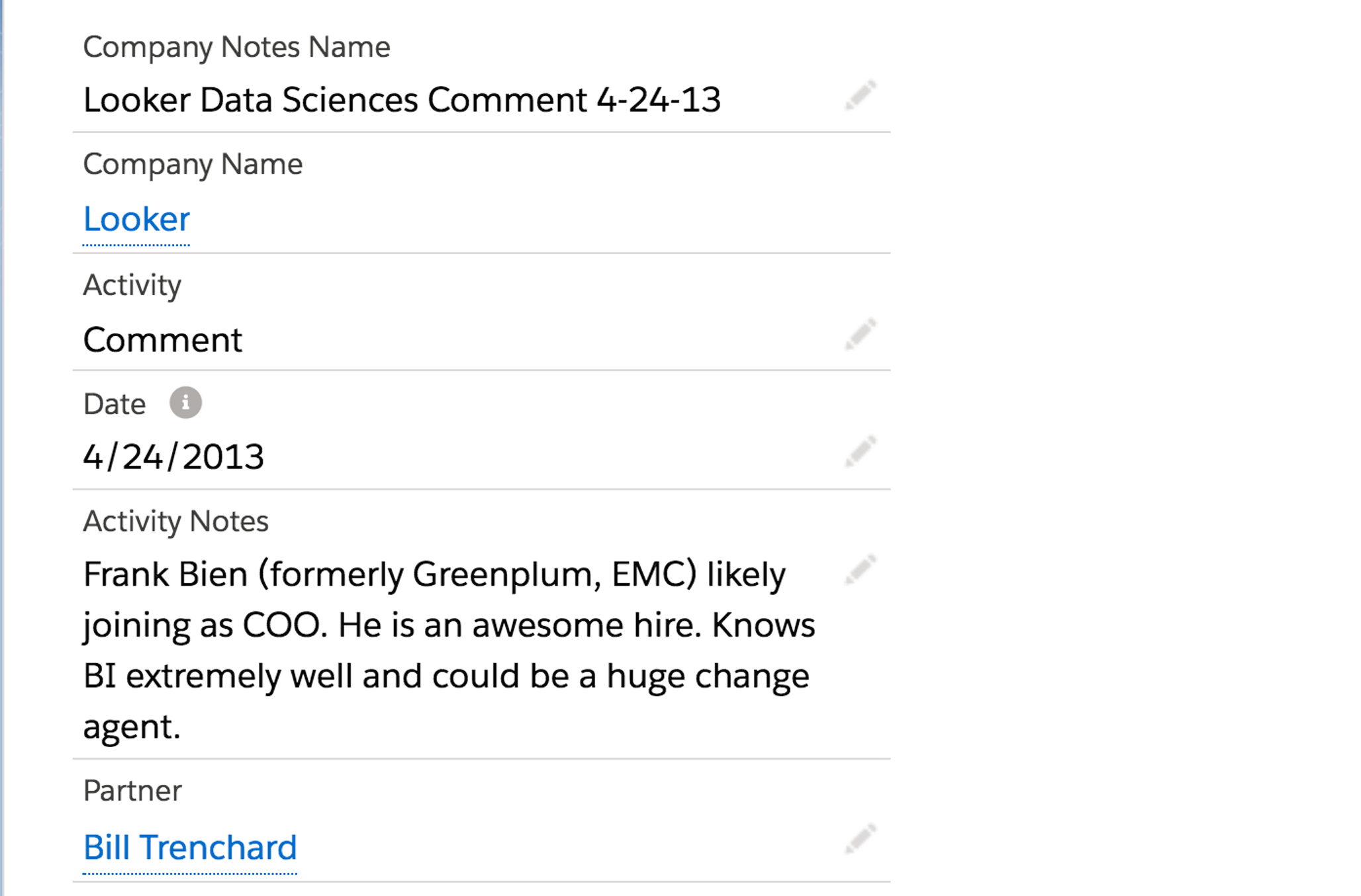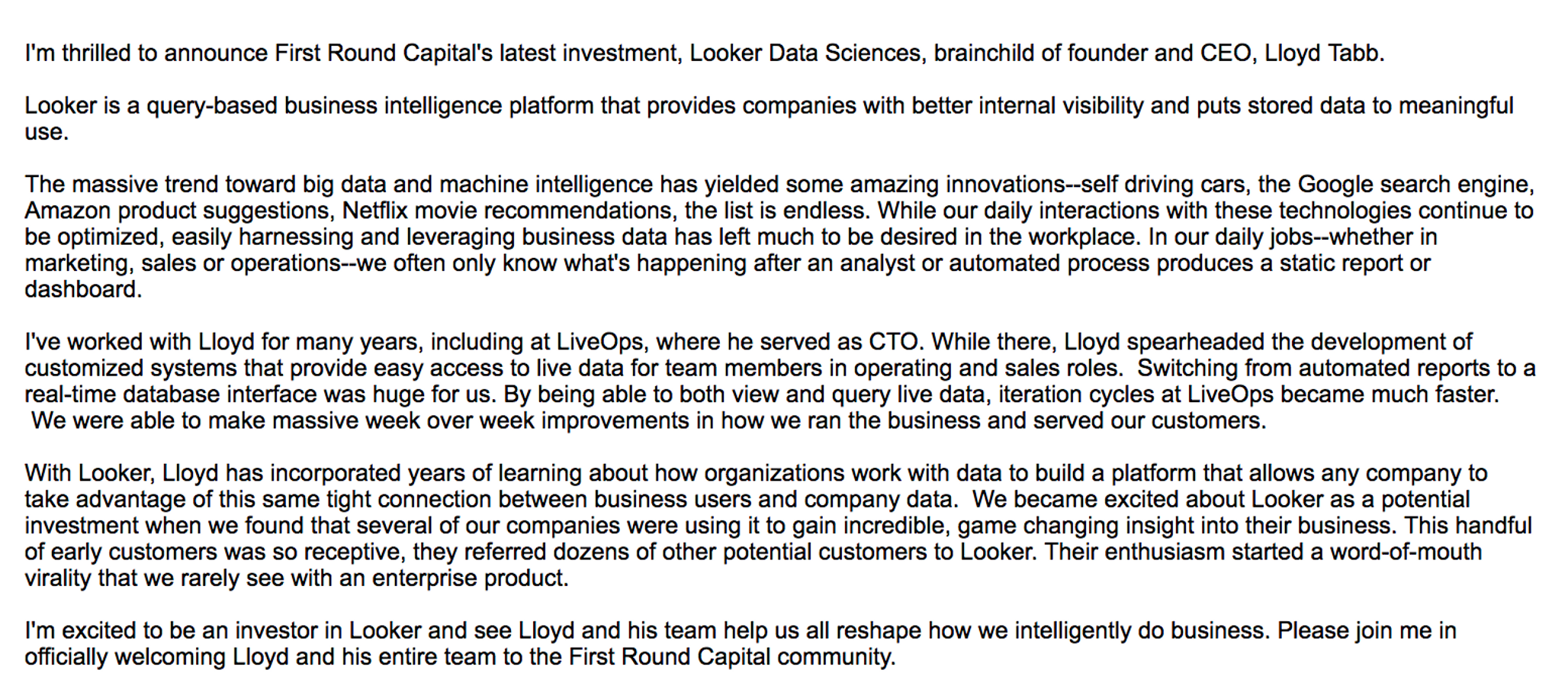 All these years later, Trenchard reflects on this advice he gave back in 2013: "We started Pitch Assist to gather fundraising wisdom for our companies because we observed that many founders were caught off guard by how they need to change their strategy for their Series A,” he says. “Fundraising advice changes based on several factors. You can’t always borrow someone else’s playbook or copy-and-paste what worked in the last round. At its Series A, Looker had strong proof points in a big market, and the play we helped them put together was the best option for them at the time. And Frank and Lloyd nailed the execution.”