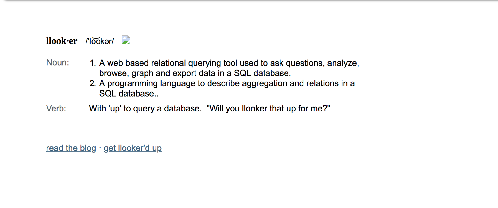 This messaging challenge led Looker to maintain a rather spartan digital presence. “Up until our Series A, a full year and a half after we had been doing business and generating customers, Looker’s website was just seven lines a text — and it was a joke,” says Tabb. “It was a mock definition of the word ‘looker’ and there was a play button icon that played audio of someone pronouncing it. We did something similar for our first tweet as well. It makes me laugh now thinking about how we were cash flow positive and that’s what our messaging looked like.”