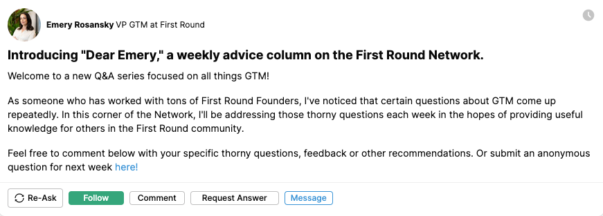 It prompted her to start writing a “Dear Abby”-style advice column, aptly named “Dear Emery,” which she shared internally with the First Round Network community. The regular column has been so well-received that we wanted to share some of her tailored advice with the wider startup community.