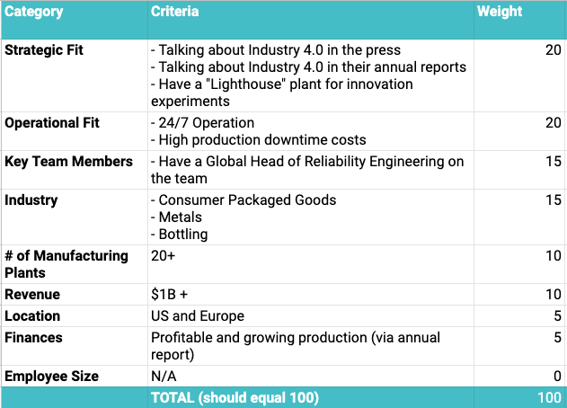 “Once you can identify the strategic and operational criteria, those often help inform the other categories. So for example, ‘high production downtime costs’ is a key operational criterion that we can then use to narrow the industries down to the ones that have the highest cost per hour of downtime,” says Rosansky. “That’s a lot more actionable than ‘manufacturing companies in the US and Europe.’ Once we narrowed in on this ICP, our win rates started to increase significantly.”
