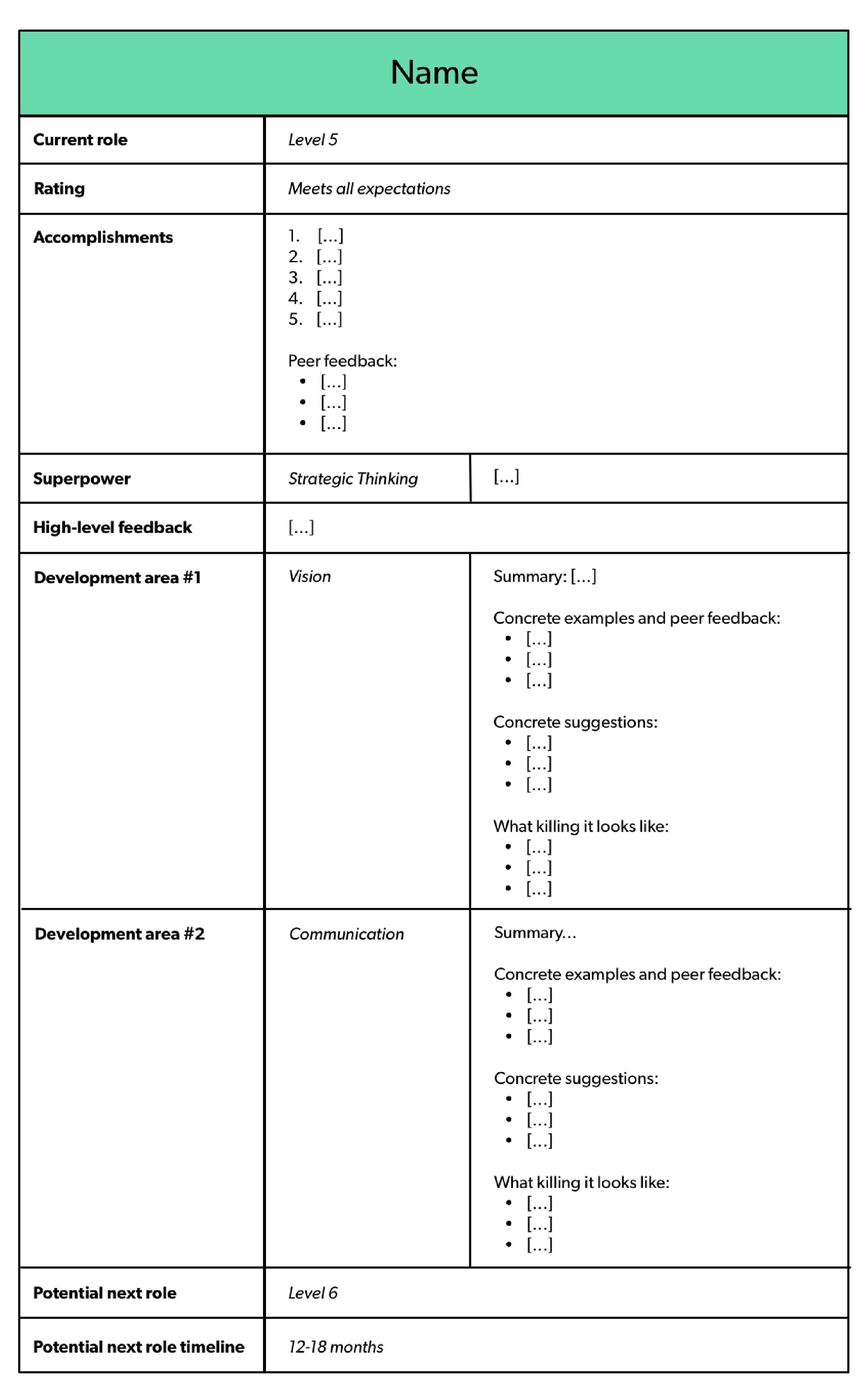 - What is most holding the person back from the next level? If your company has a leveling system, leverage it to explain your thinking.