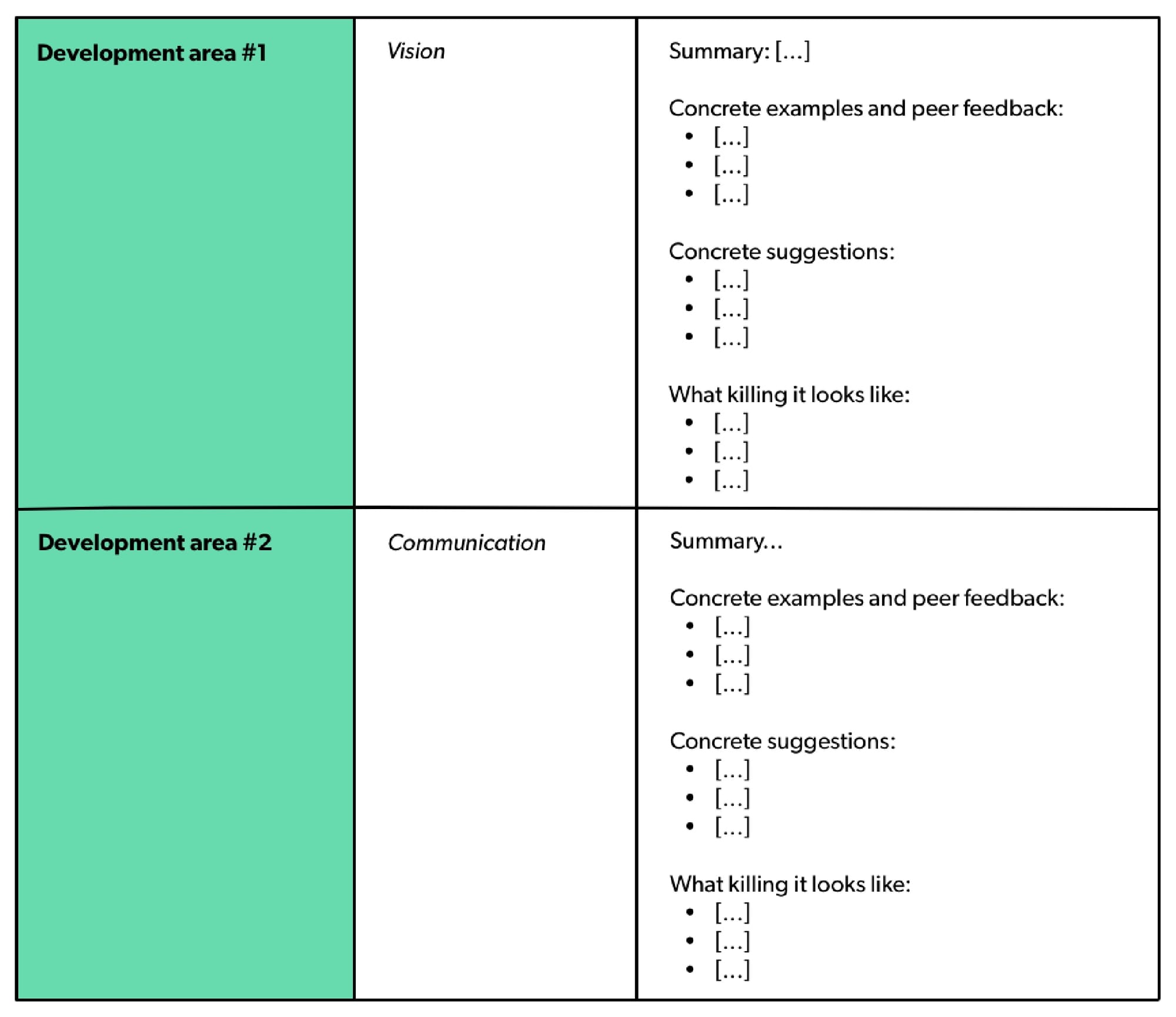 - Identify 1-2 development areas, with examples, concrete suggestions, and what “killing it” would look like